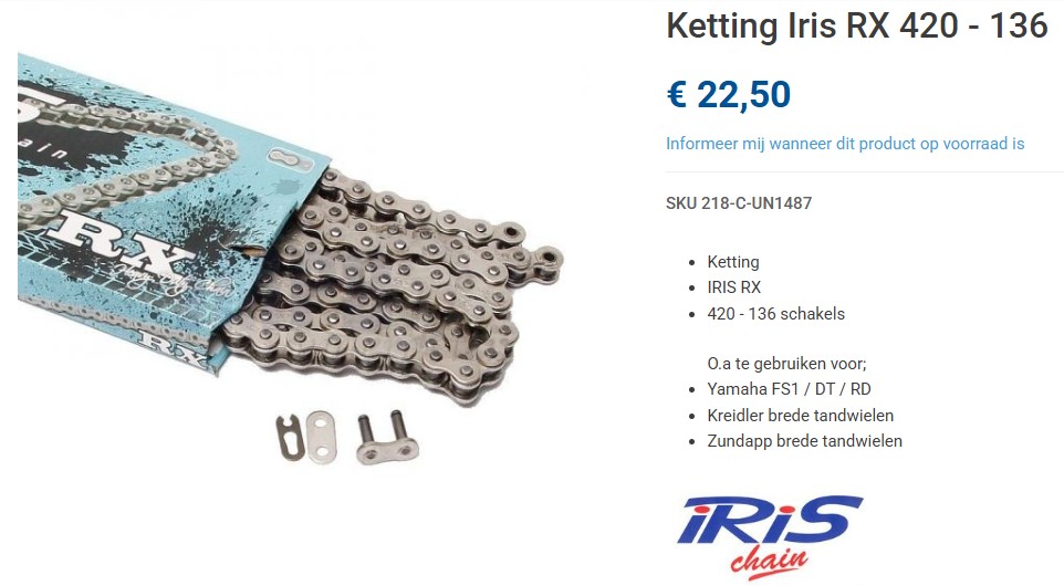 Kettingen zijn er in veel soorten en maten ik gebruik ook iris merk ook div maten 5,16 en 420 met bijbehorende tandwielen .
