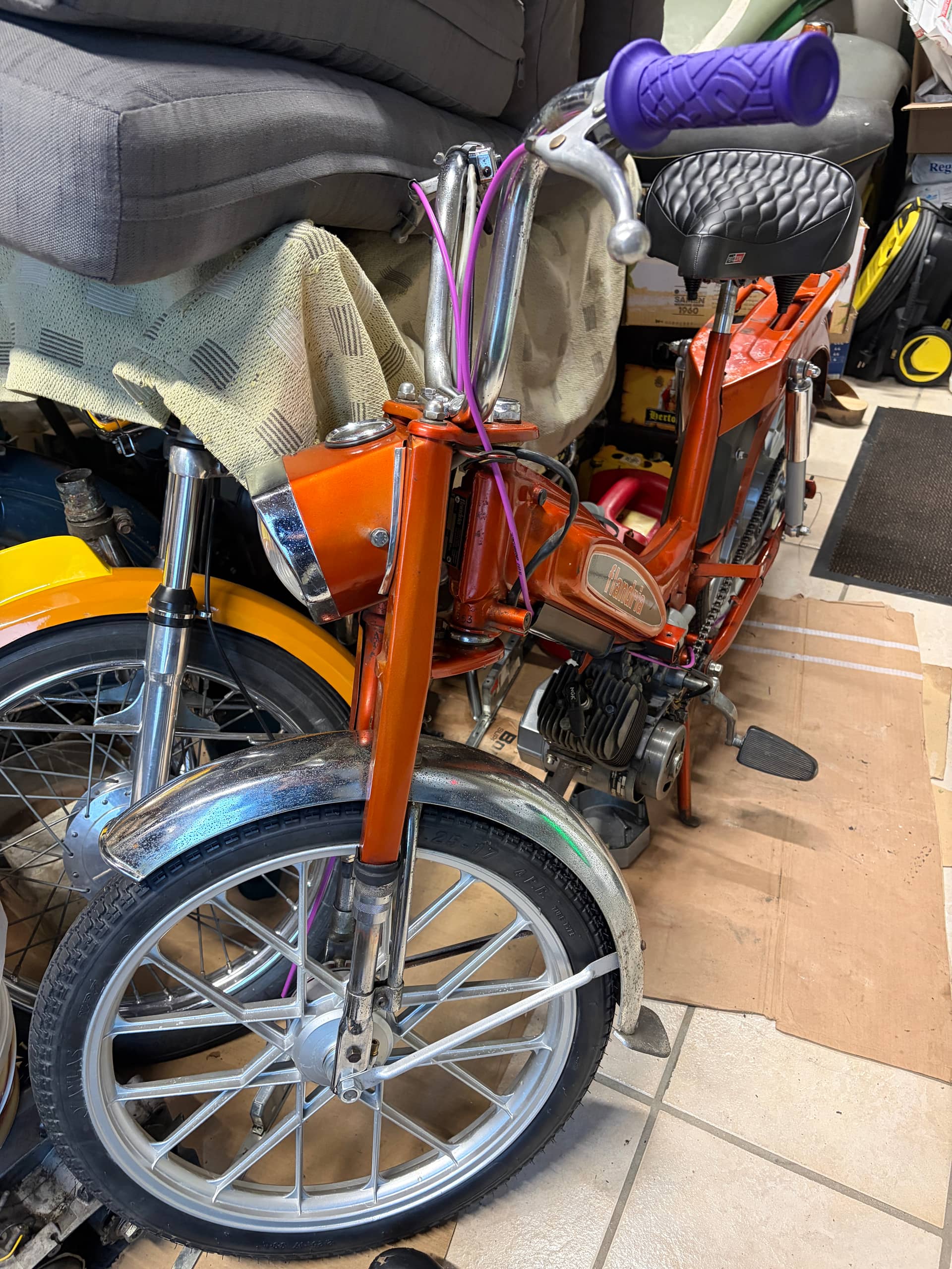 Naast het wiel heb ik ook alvast nieuwe remkabels gestoken. De vorige waren helemaal kapot en verroest en gingen erg stroef. Als we dan toch bezig zijn gelijk maar een vrolijk kleurtje gebruiken. De handvaten en de remkabels worden mooi paars, wat lekker bij de kleuren uit de jaren 70 past.
