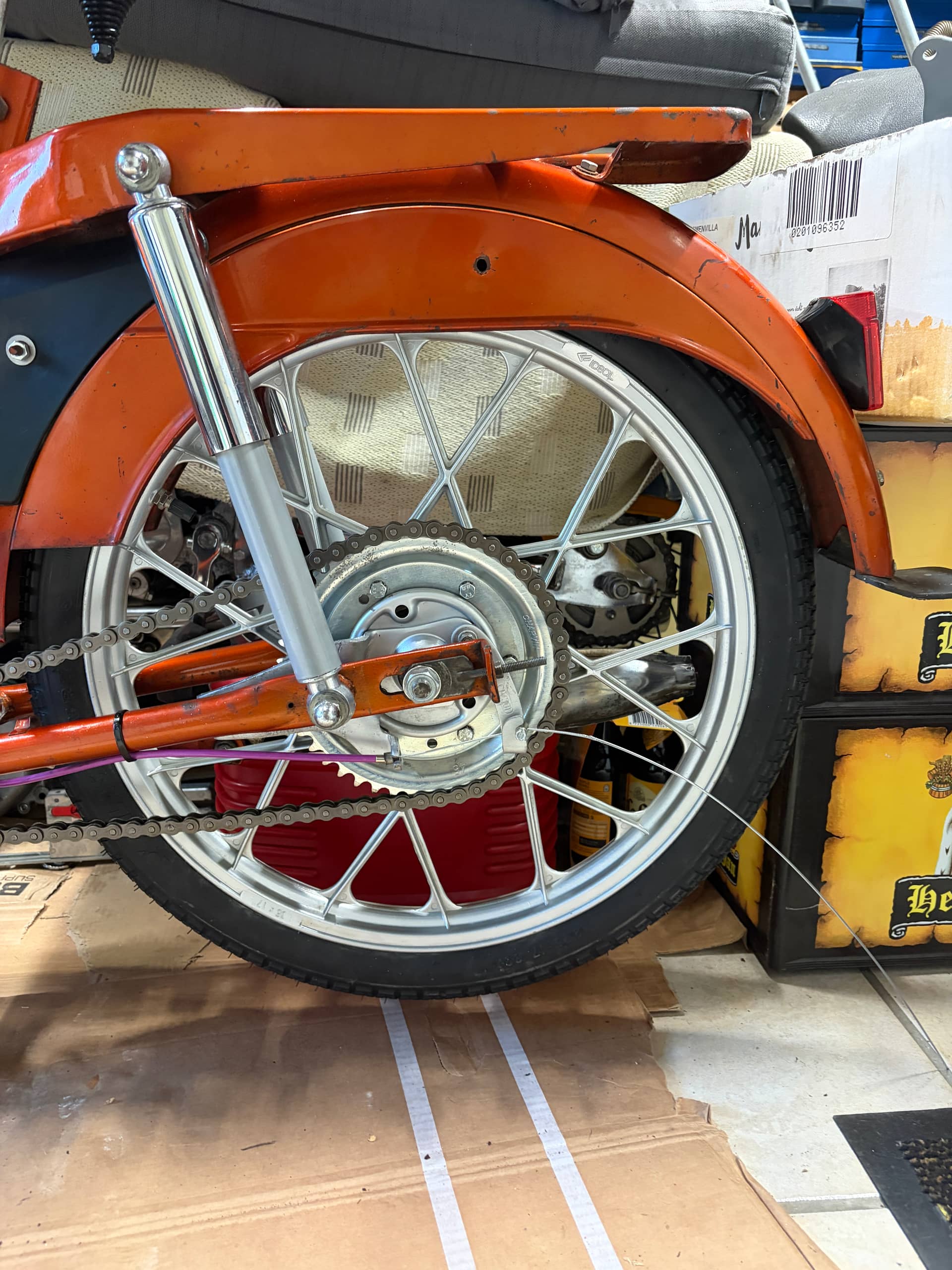 Gisteren weer lekker aan het hobbyen geweest. Ben begonnen met het achterwiel correct uit te lijnen. na een beetje spelen met wat ringetjes is het wiel mooi recht in de achterbrug gekomen. Gelijk even de ketting passend gemaakt en getest. Bij het trappen loopt de ketting nu net tegen het carter doordat het achter tandwiel nu veel groter is dan het origineel. daardoor loopt de ketting te ver naar boven en schuurt hij net het randje van het karter. Toch maar een kleinere besteld.