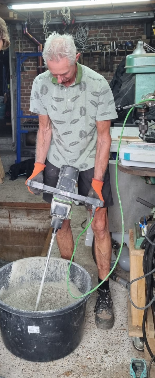 27 zakjes betonmortel met hulp van zoon en schoonzoon gestort, netje erin en met trilnaald mooi vloertje van 20cm dik.
