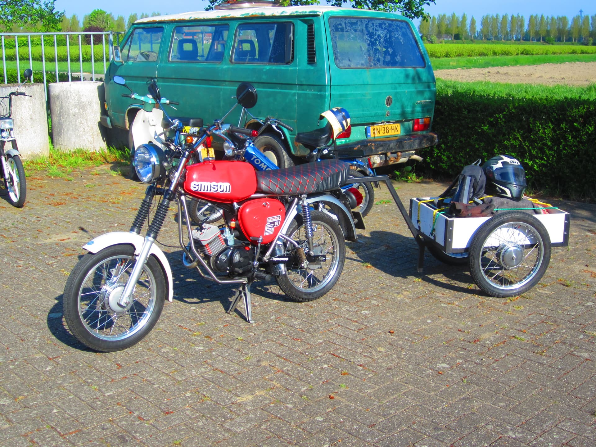 Het is wel een gedoe hoor eerst uit de berging halen , de wielen er onder dan de steekassen vast zetten de trekboom vast bouten , planken er in dan pas kun je de Simson ervoor zetten .