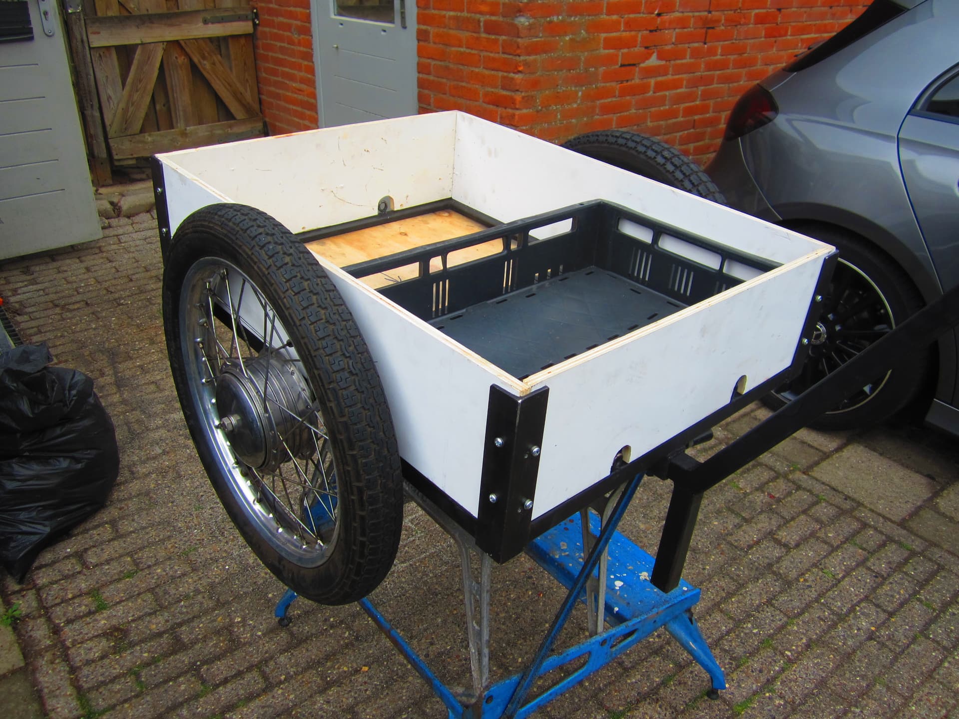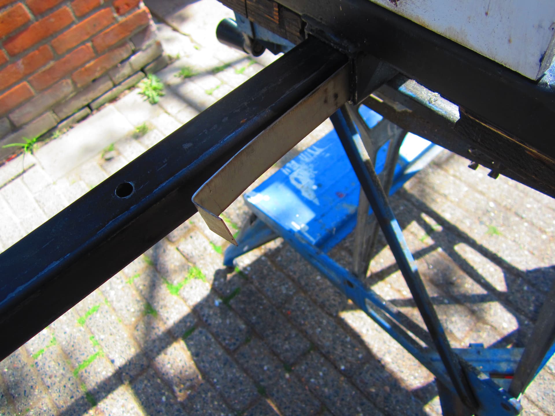 Vandaag op de hoeken hoeklijn gelast ,zodat er een plankje tussen kan [kan ik een kub zand vervoeren ].