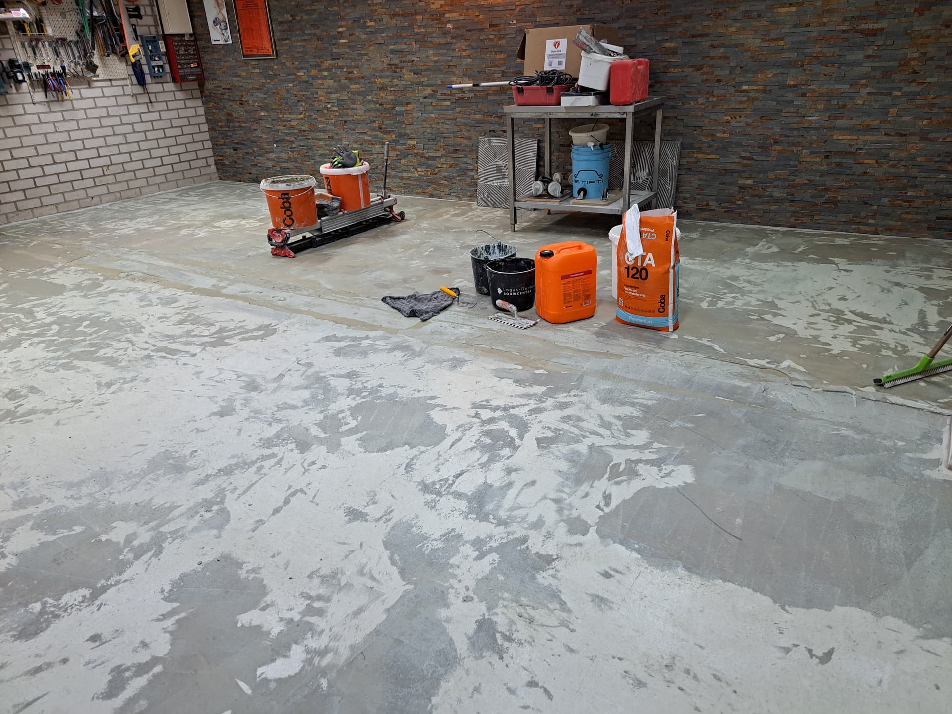 Ik heb de vloer flink opgeschuurd voor een betere hechting, er zat ook wel wat hoogteverschil in dus er gingen ruim 10 zakken lijm van 25kg in.