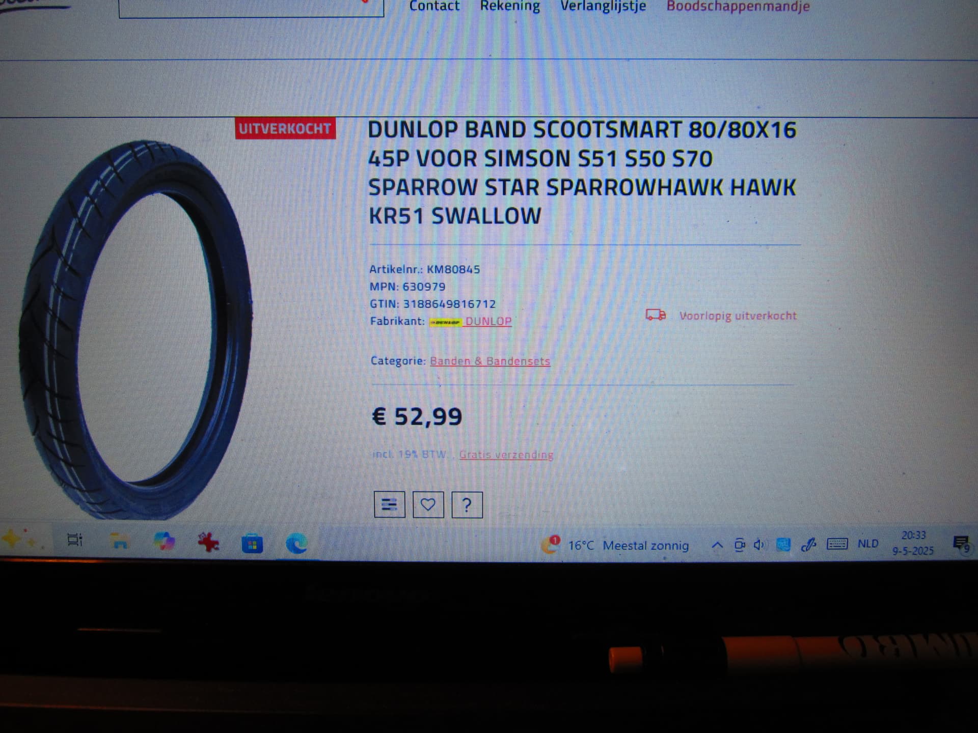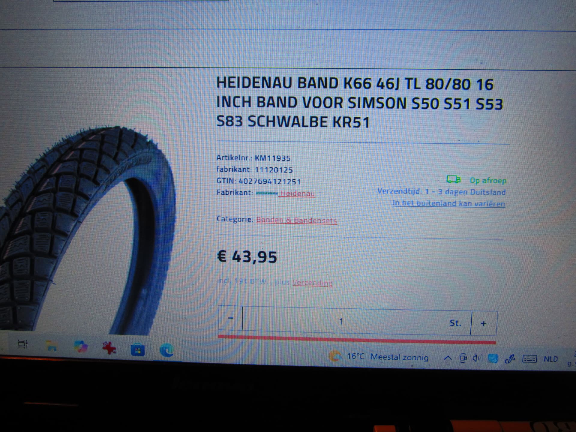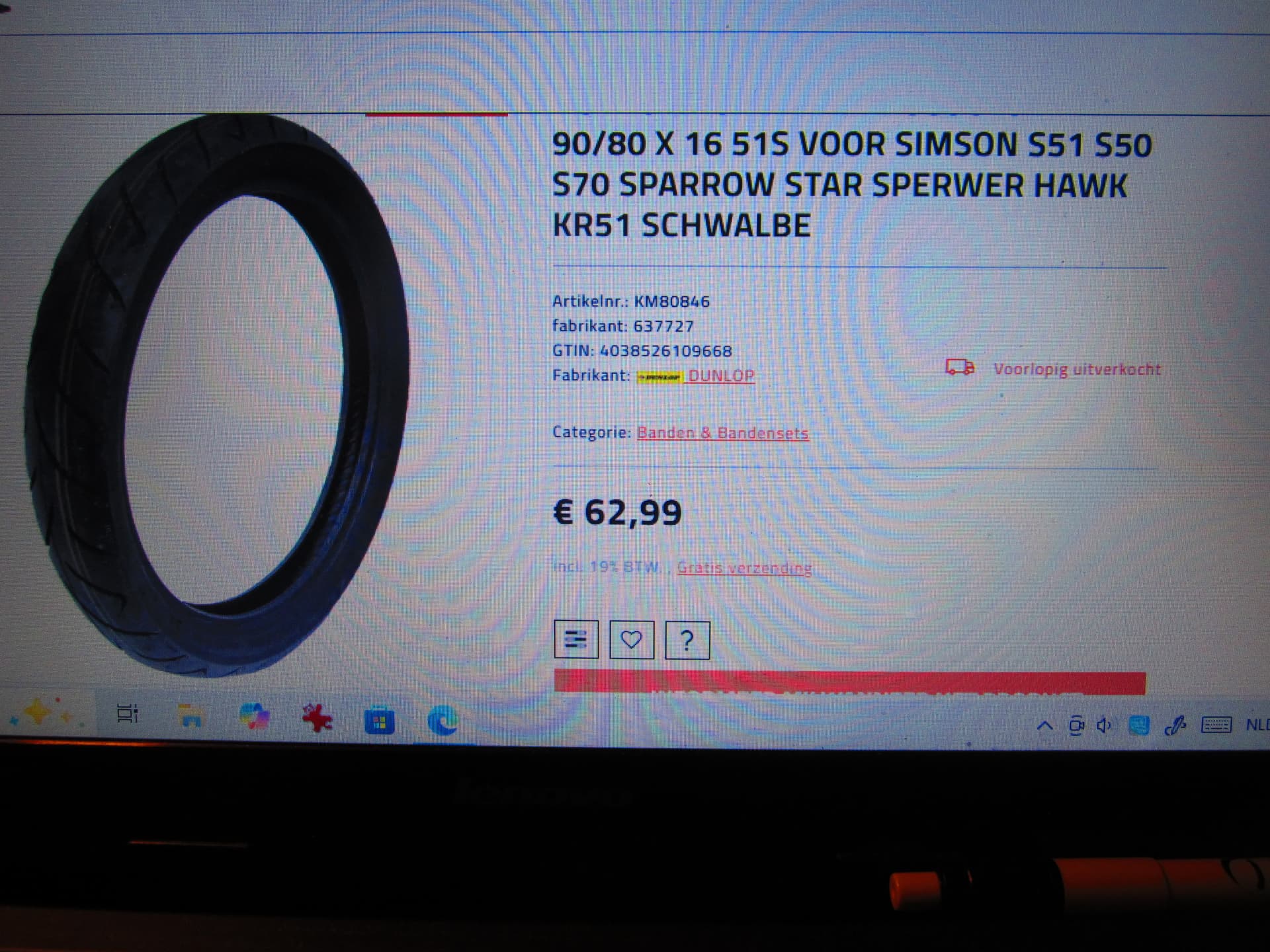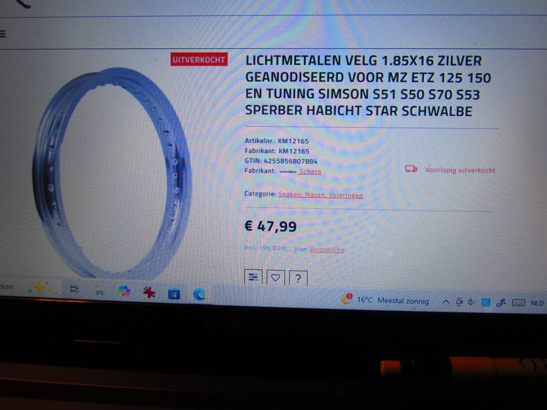 Zie ik zo n 6 weken geleden een advertentie op Markt plaats van 2 brede Simson velgen 185 x 16 alu plus 2 Dunlop banden bied 10 euro meer als de laatste bieding,. hoor een hele week niets en dan een korte mail van ,.Is goed,. ik mijn adres gegevens gegeven weer een week geen antwoord na dat ik zijn bankgegevens had ,betaald weer een week niets ,was al een beetje bang