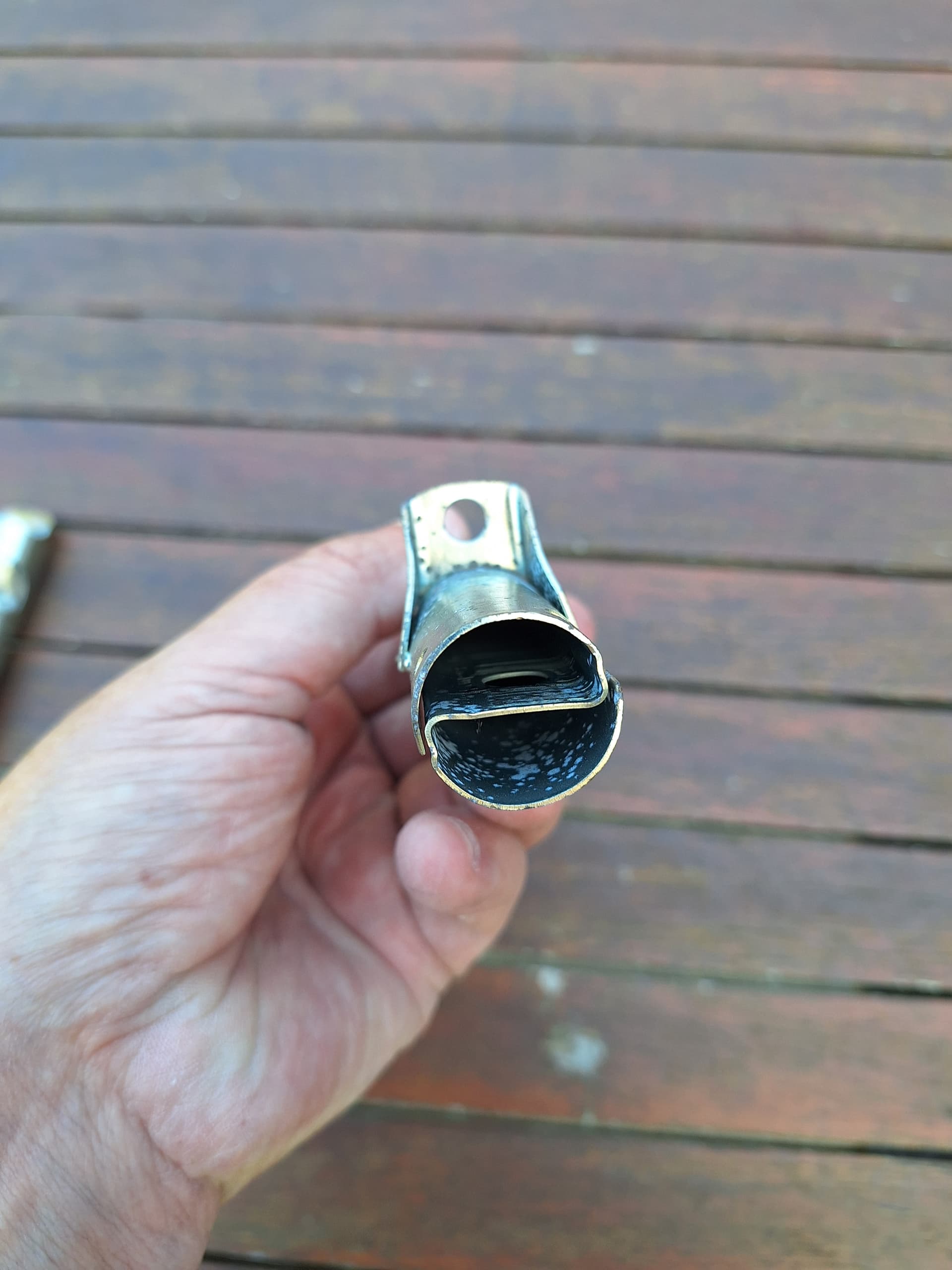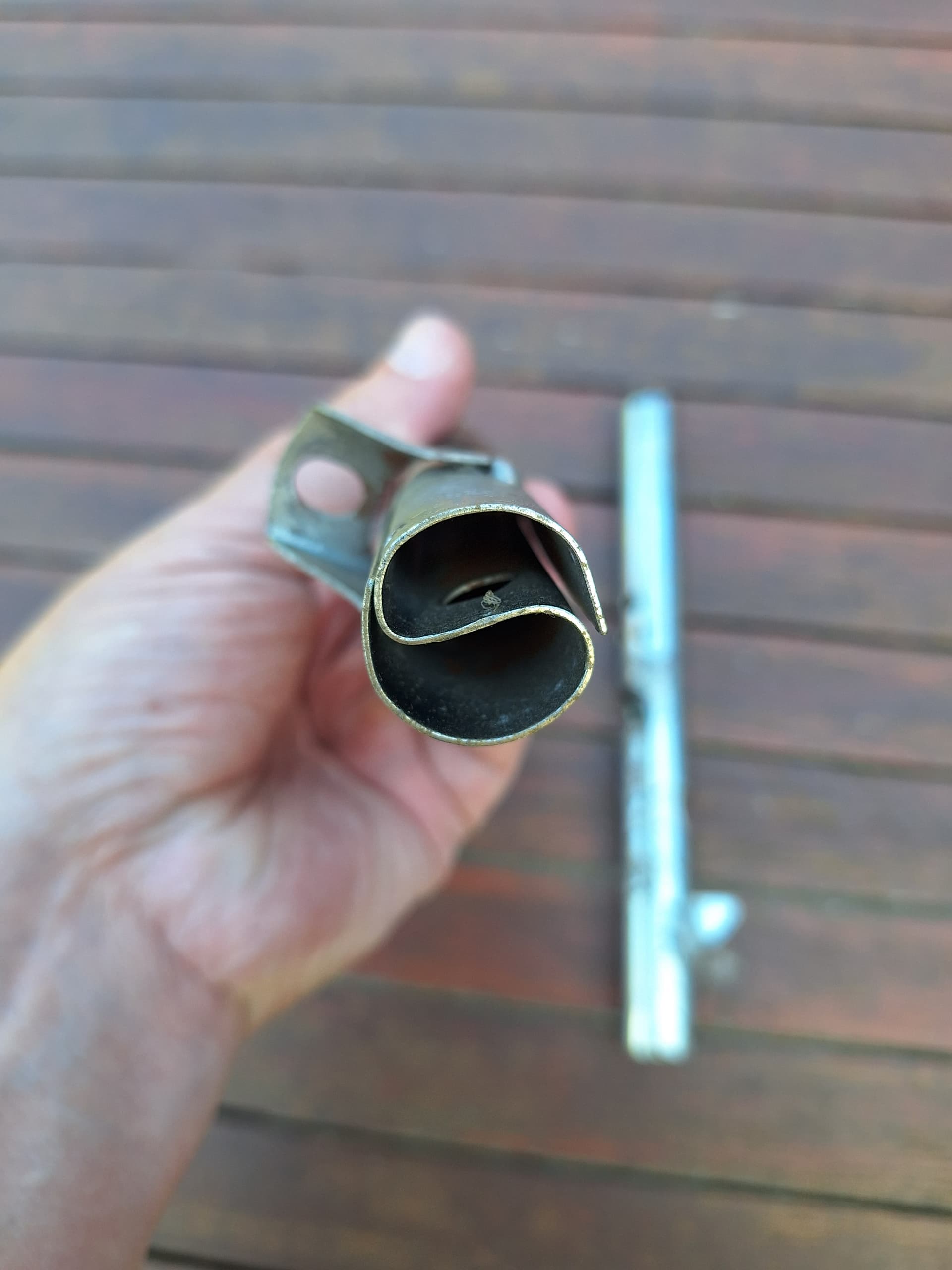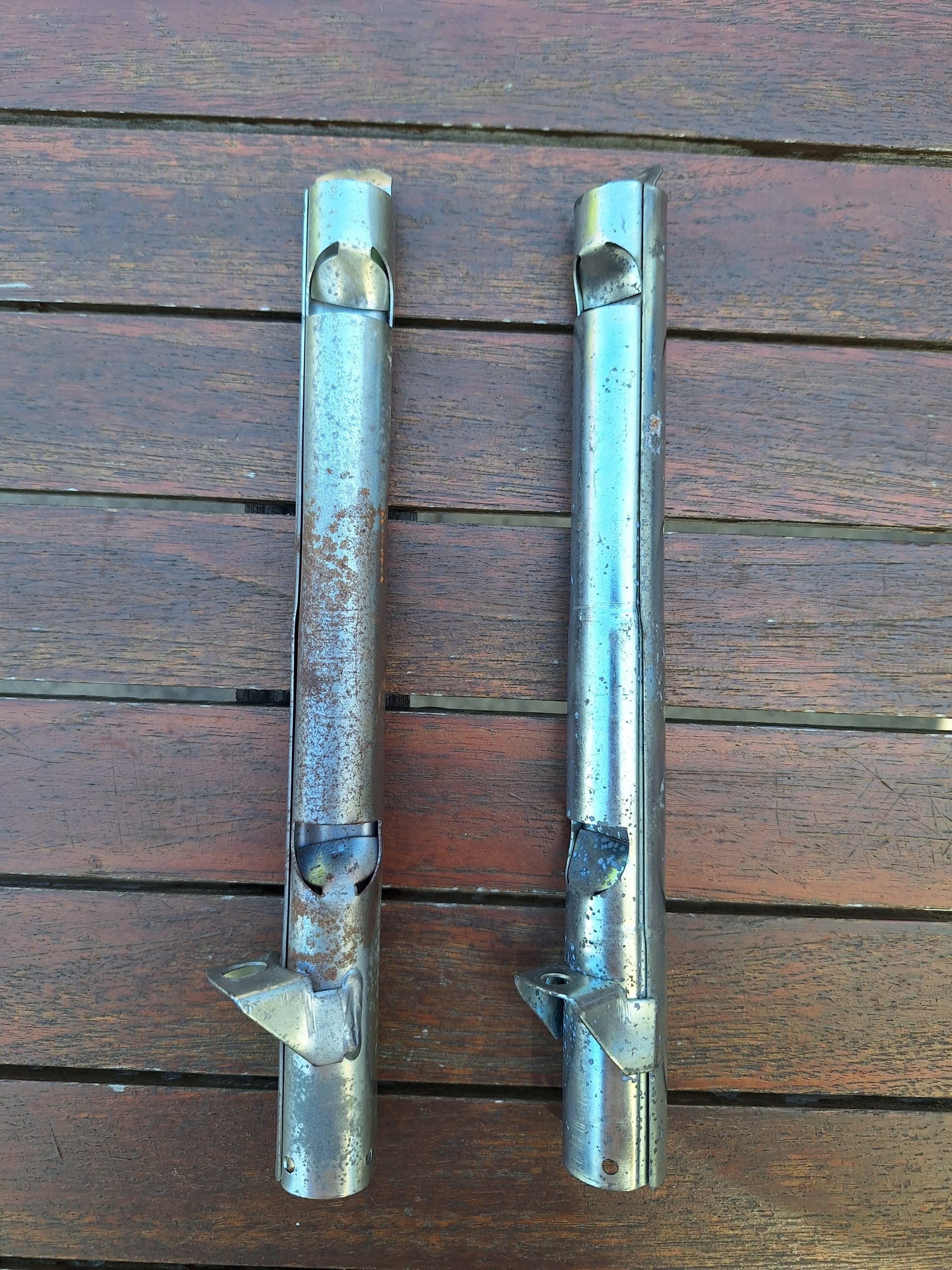 Nog wat foto’s erbij. De oude gerepareerde, en een imitatie en de originele, te herkennen aan het rechte plaatje/schot en de s-vorm van de imitatie.