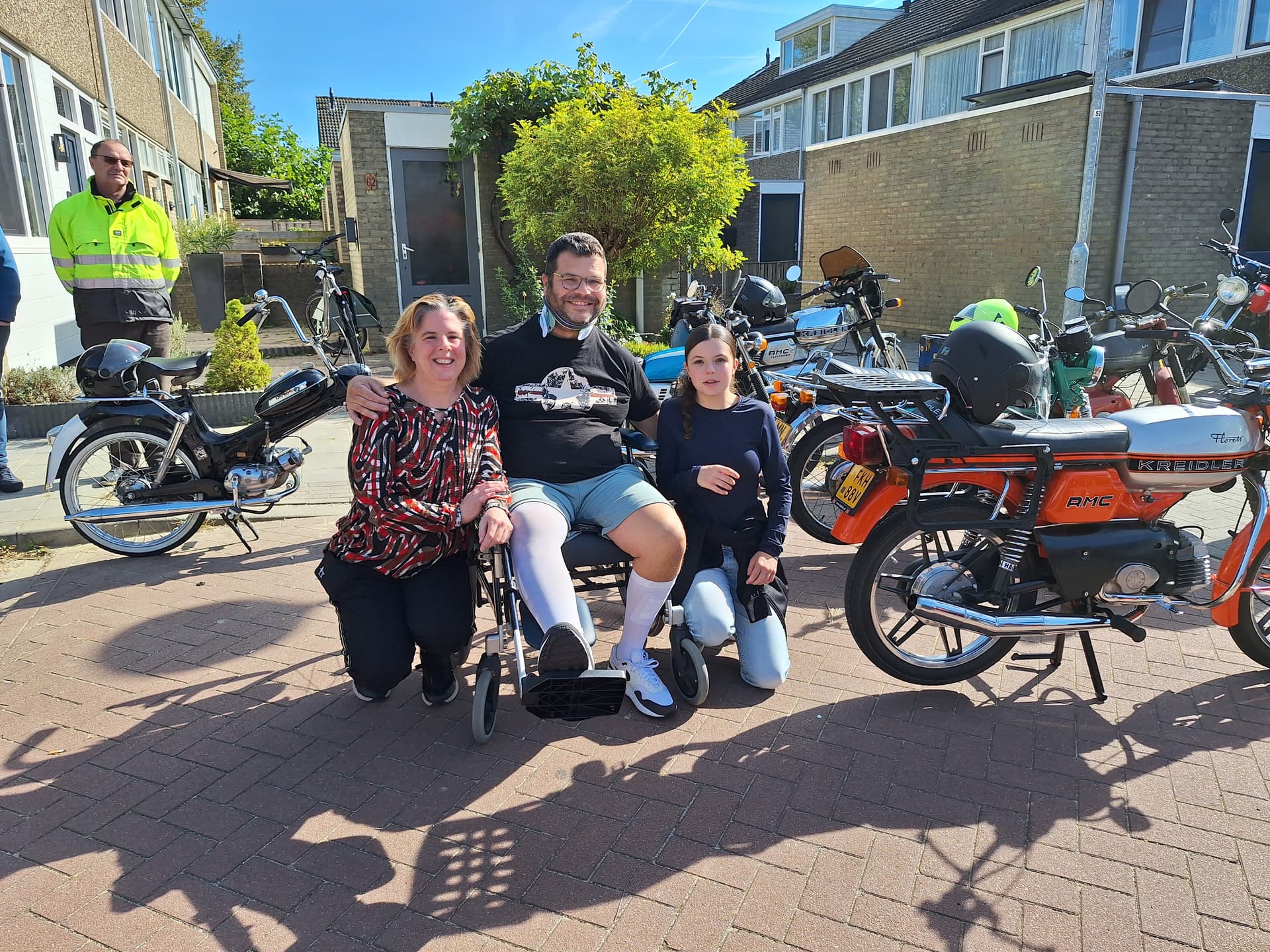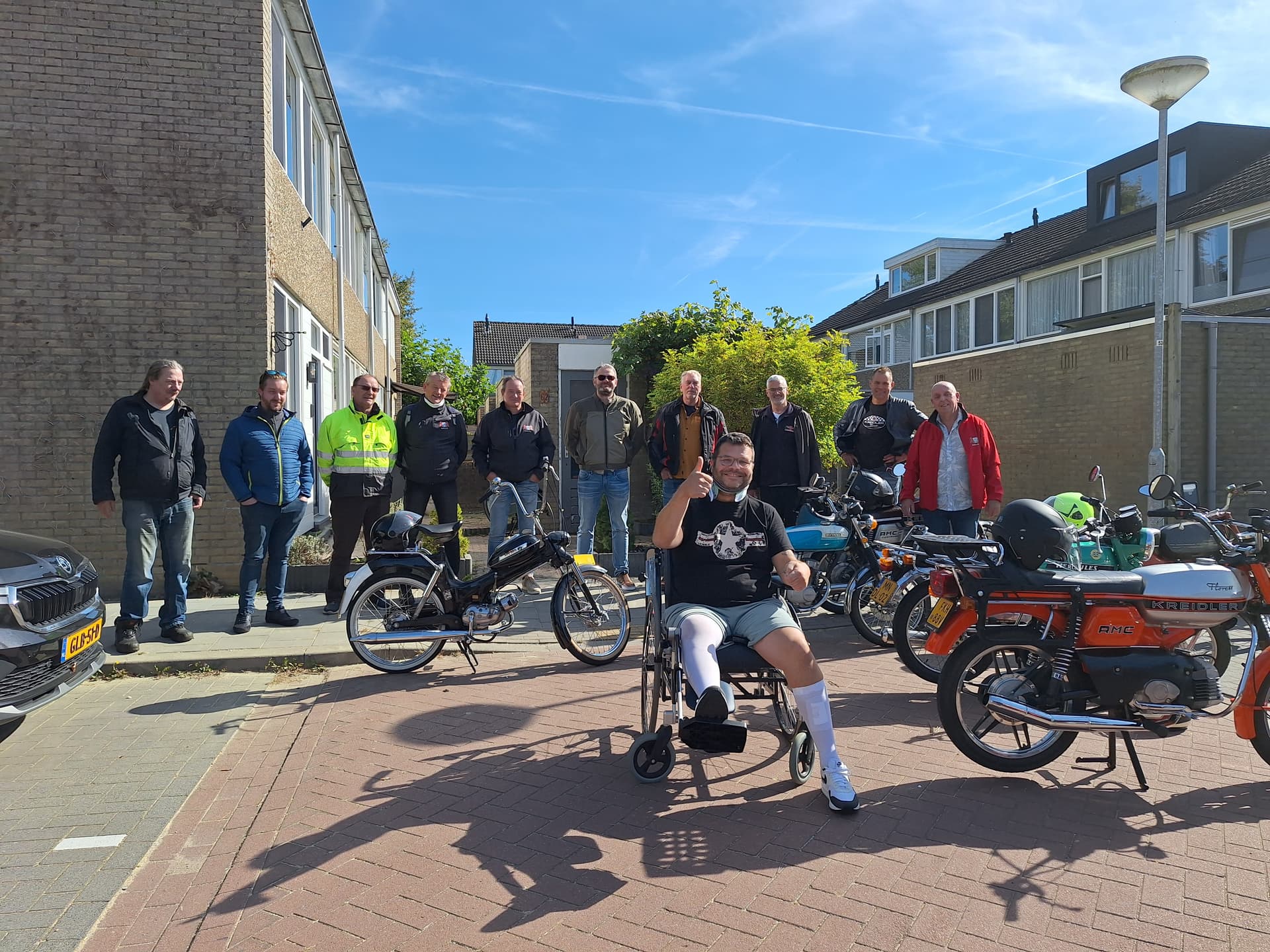 Wilko heeft begint deze maand een zwaar ongeluk mee gemaakt met zijn scooter. Zijn vrouw mailde mij met de vraag of er wat leden met de brommer langs wilde komen. Vandaag, zondag, mocht Wilko een dagje naar huis en het zou een goede oppepper voor hem zijn. Vanavond moet hij weer terug zijn in het revalidatiecentrum Goes. Ligt dus al de hele maand of in het ziekenhuis of in het revalidatiecentrum. Een paar mensen benaderd en wilde hier graag gehoor aan geven. Met 10 leden langs gegaan. Hij vond het prachtig en een grote glimlach op zijn gezicht was te zien. Met toestemming van Wilko mag ik hier ook foto 's plaatsen. We wensen Wilko een vlot en snel herstel.