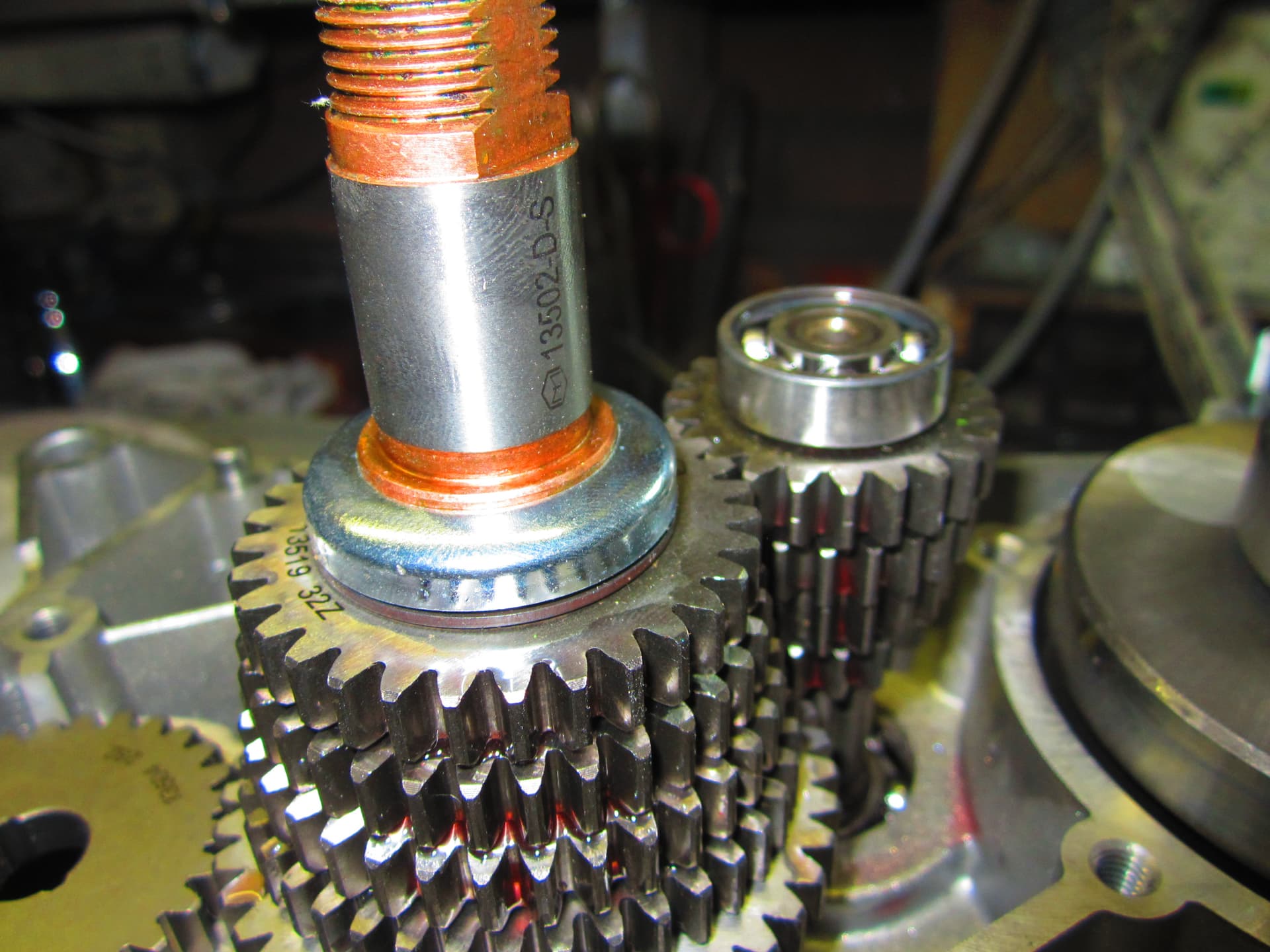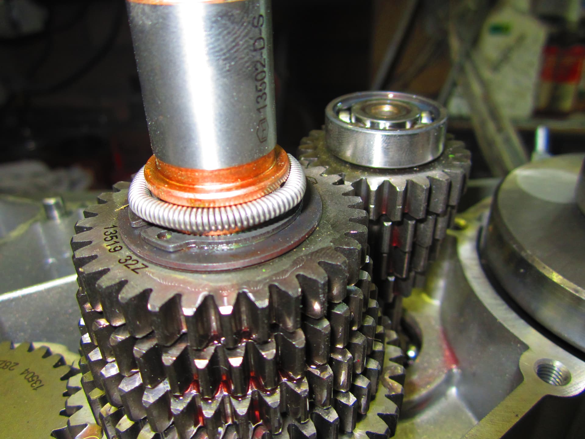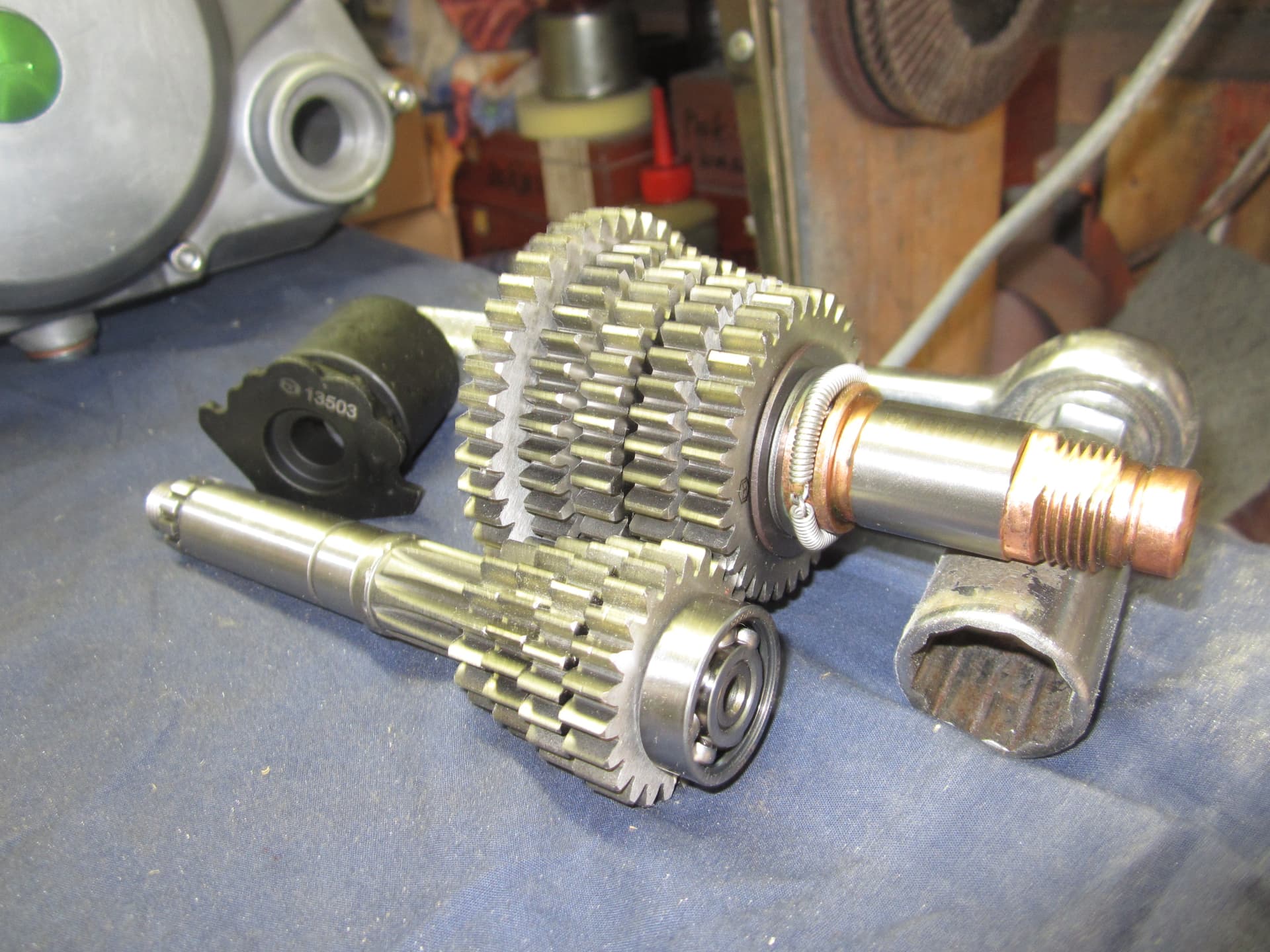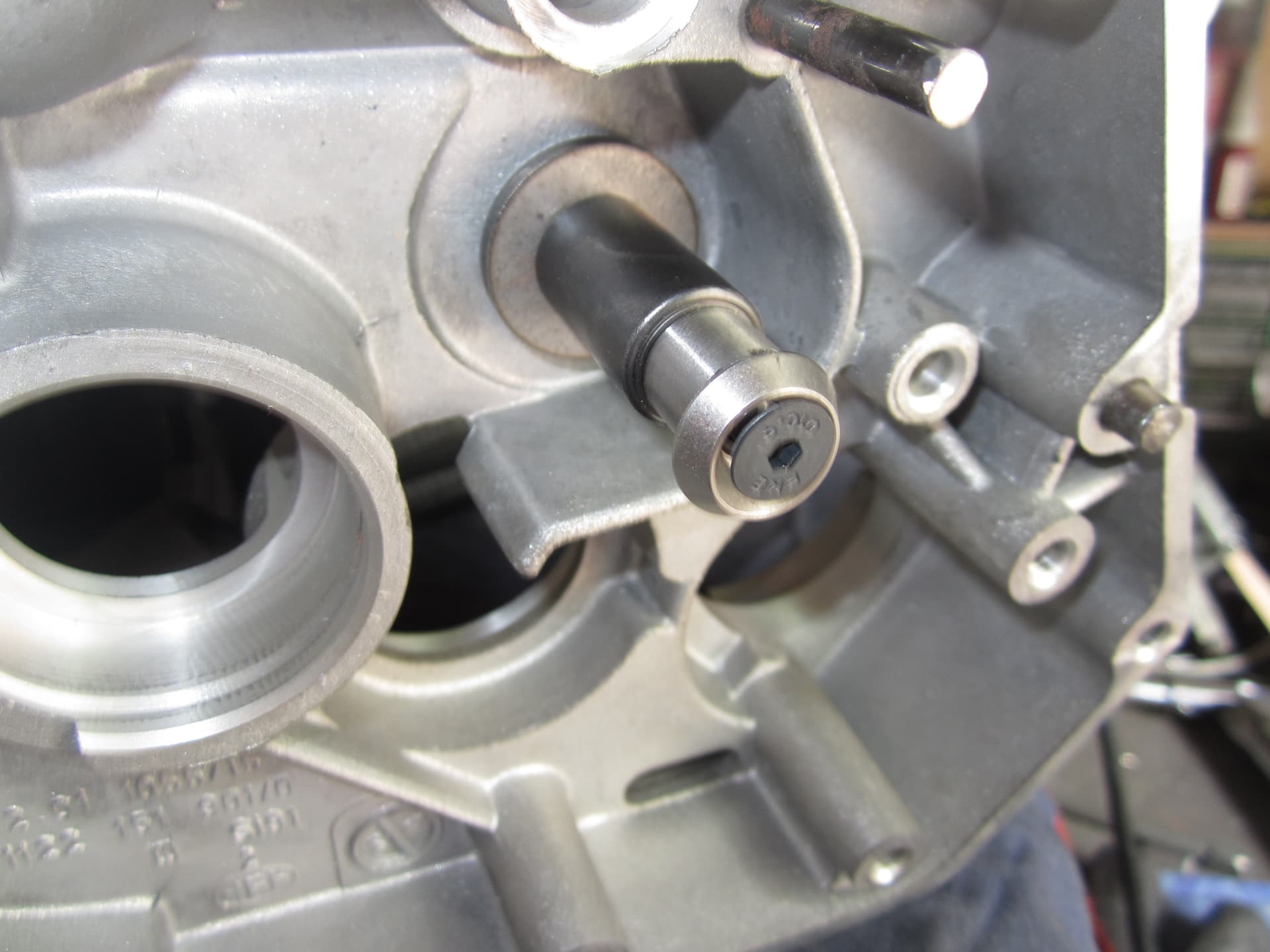 Opbouw Simson blok met speciale dingen dit blok heeft een geschroefde schakel rol normaal is de rol vast gezet met een borg ring .