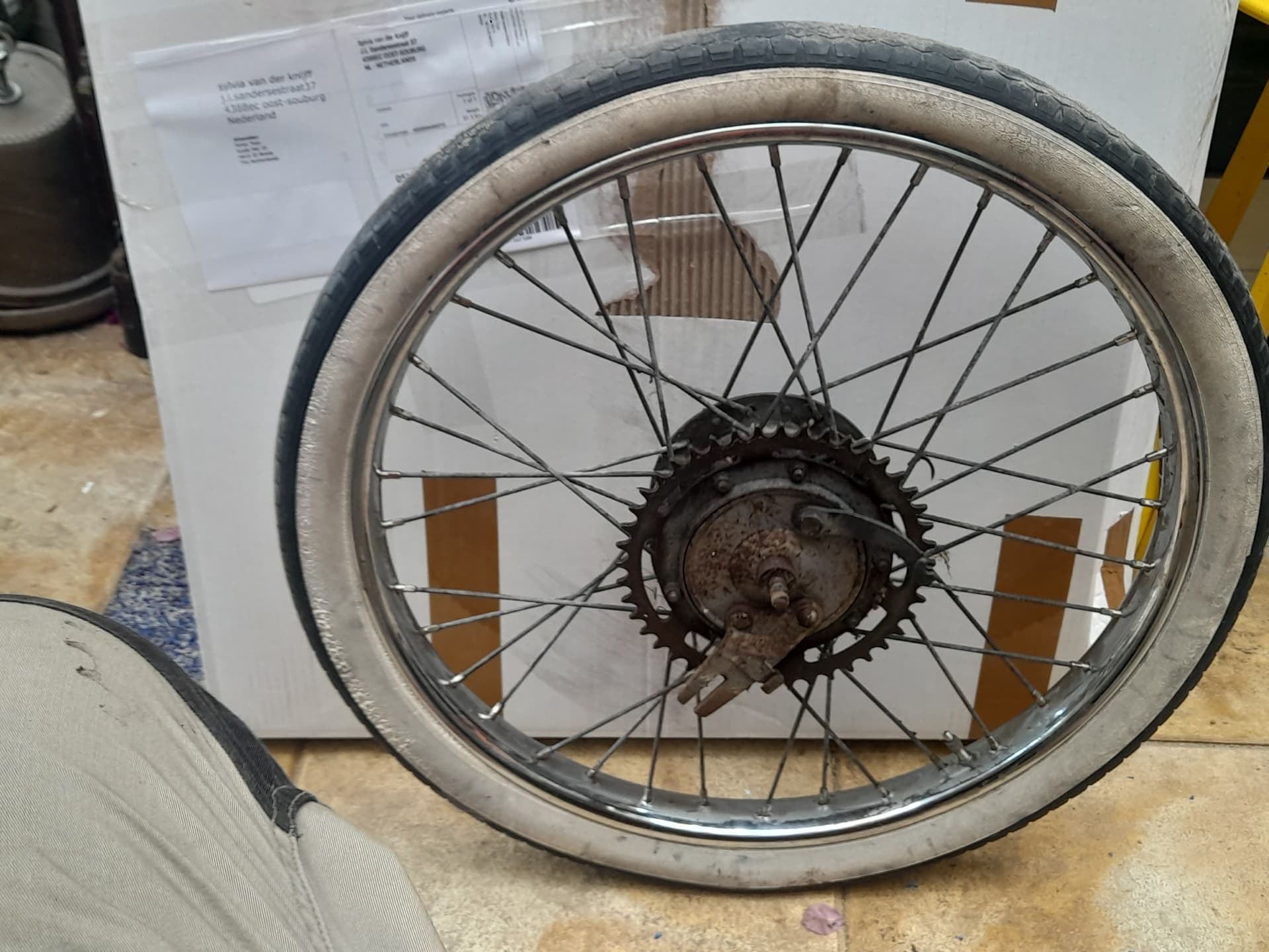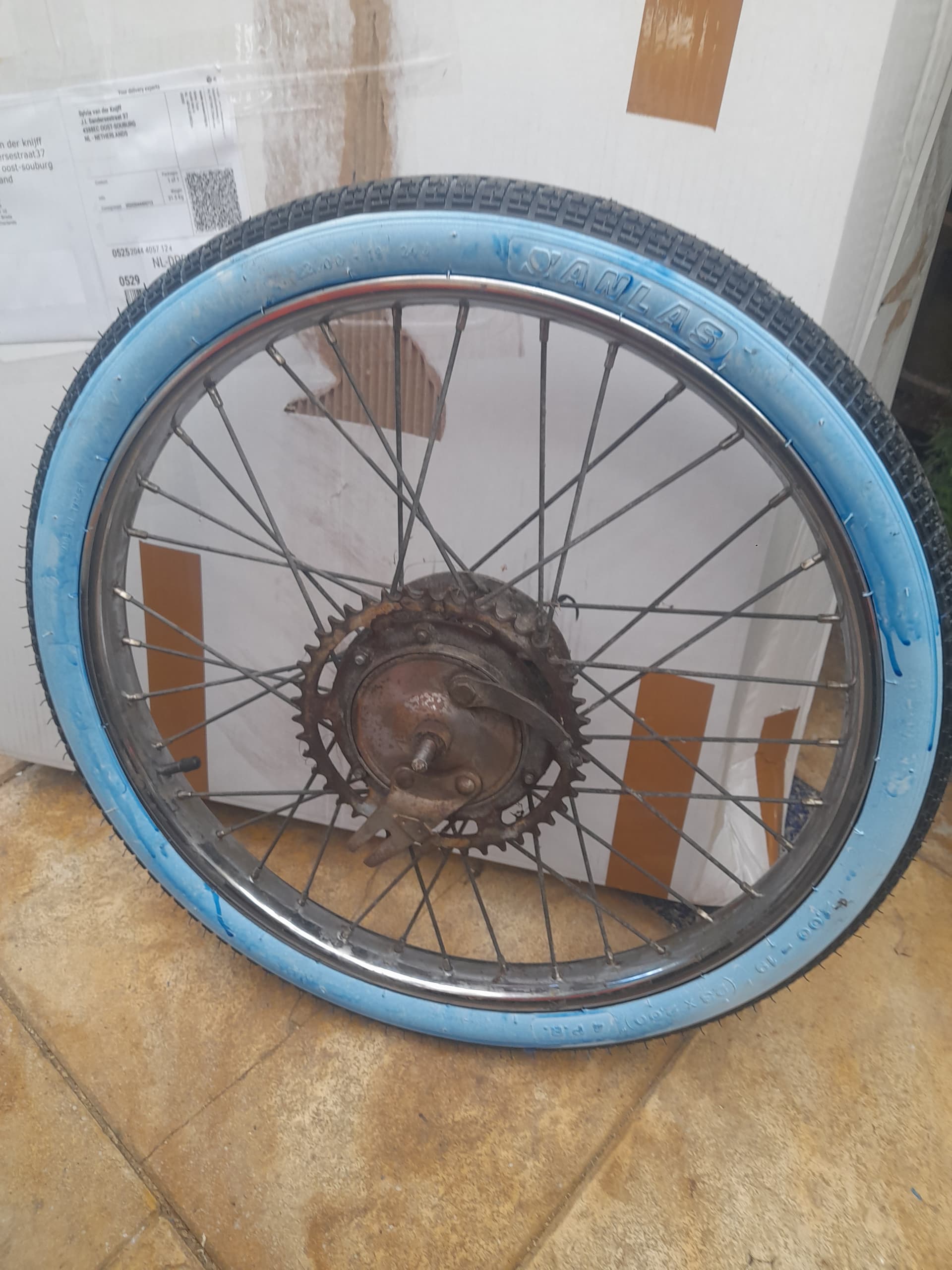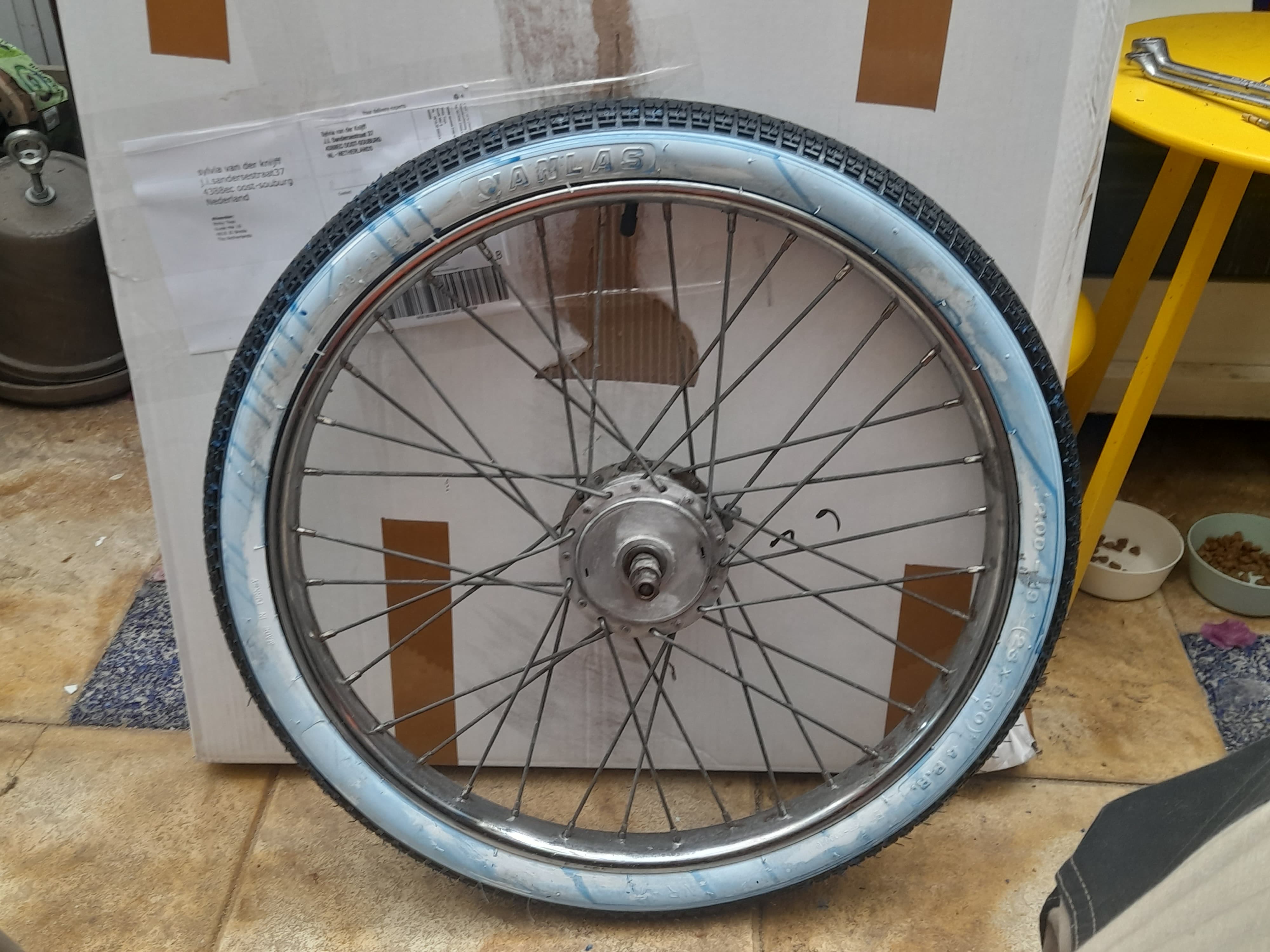 Nieuwe banden gemonteerd om hem beter verplaatsbaar te maken