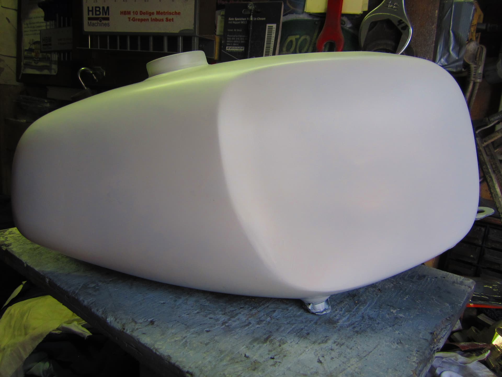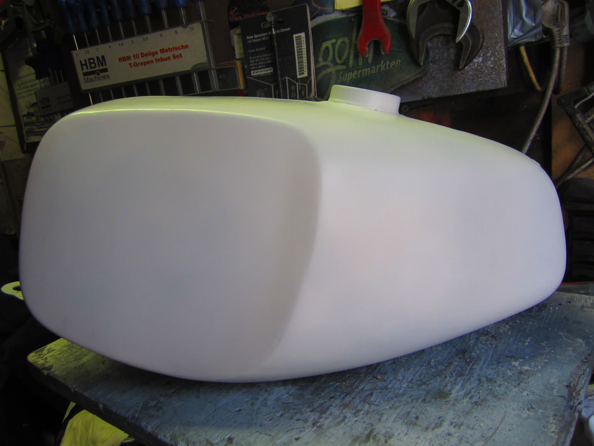 Cor niet doen, straks krijg je spijt als de lak er op zit. Je hebt voordeel dat er geen chroom op zit. Dus dan moet 99% gaan lukken, niet overhaast spuiten. De primer zit er op, verschillende hoeken langs de tank kijken en met stift even aantippen waar oneffenheden zitten vlgs jou die in beeld komen. Wil je wel een keertje helpen ôh.
