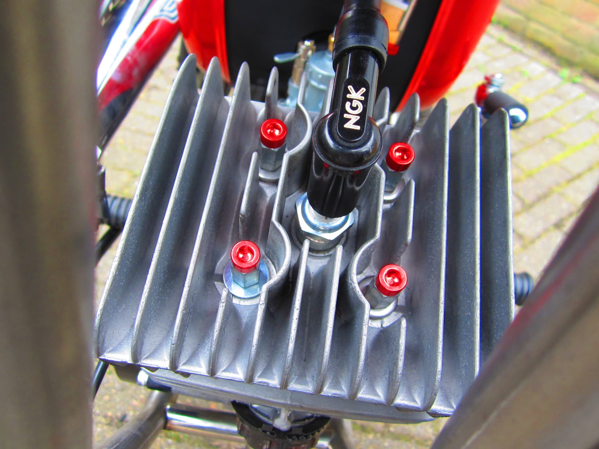 Deze week NOG een paar rode accenten aangebracht op de Simson ,de cil zit met koppelmoeren vast en daar passen deze boutjes mooi in .