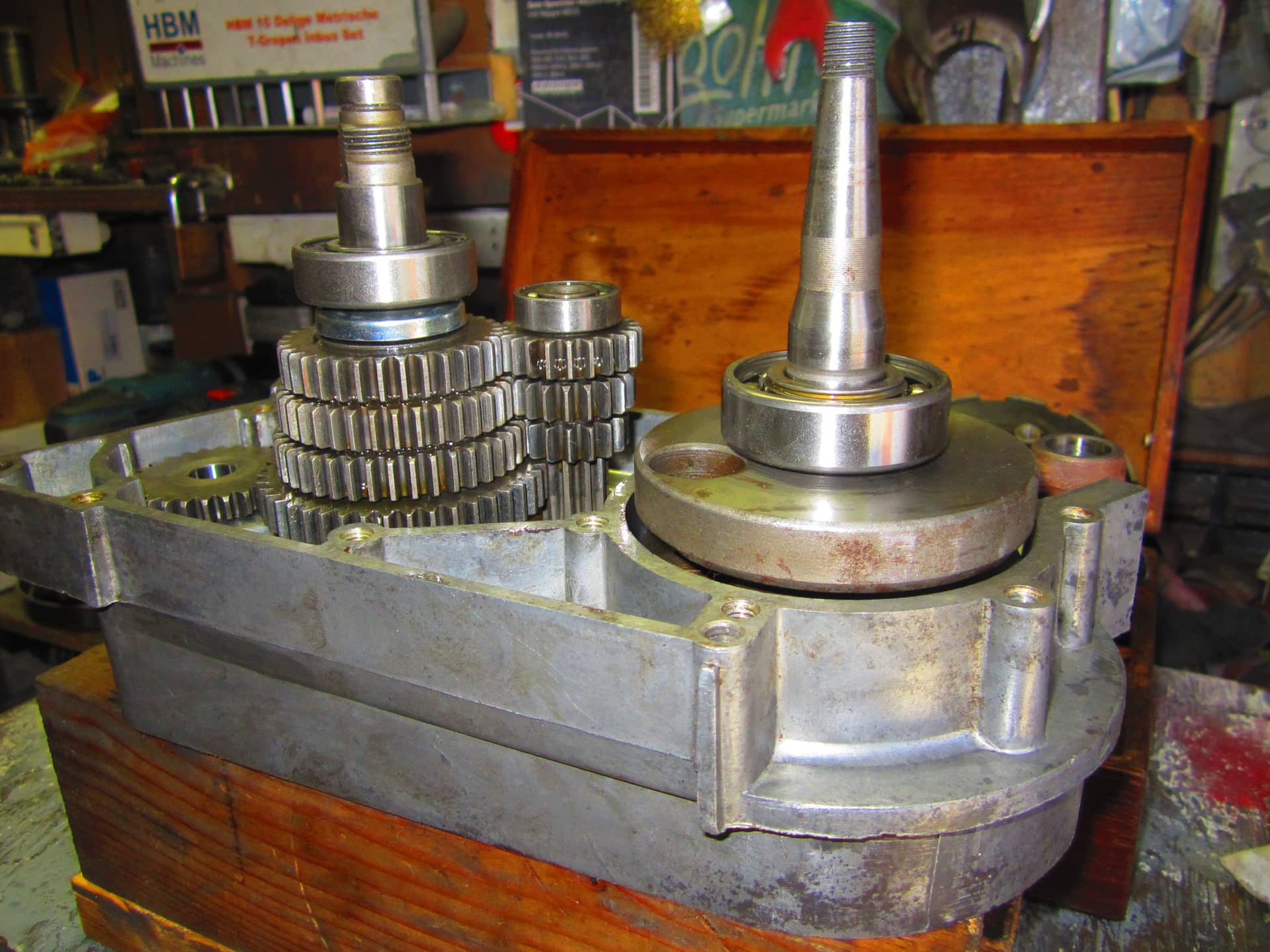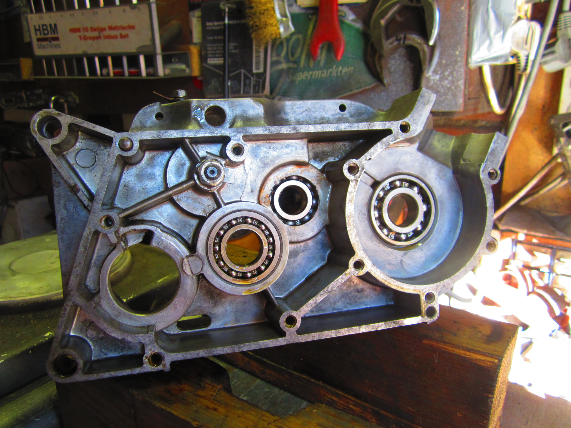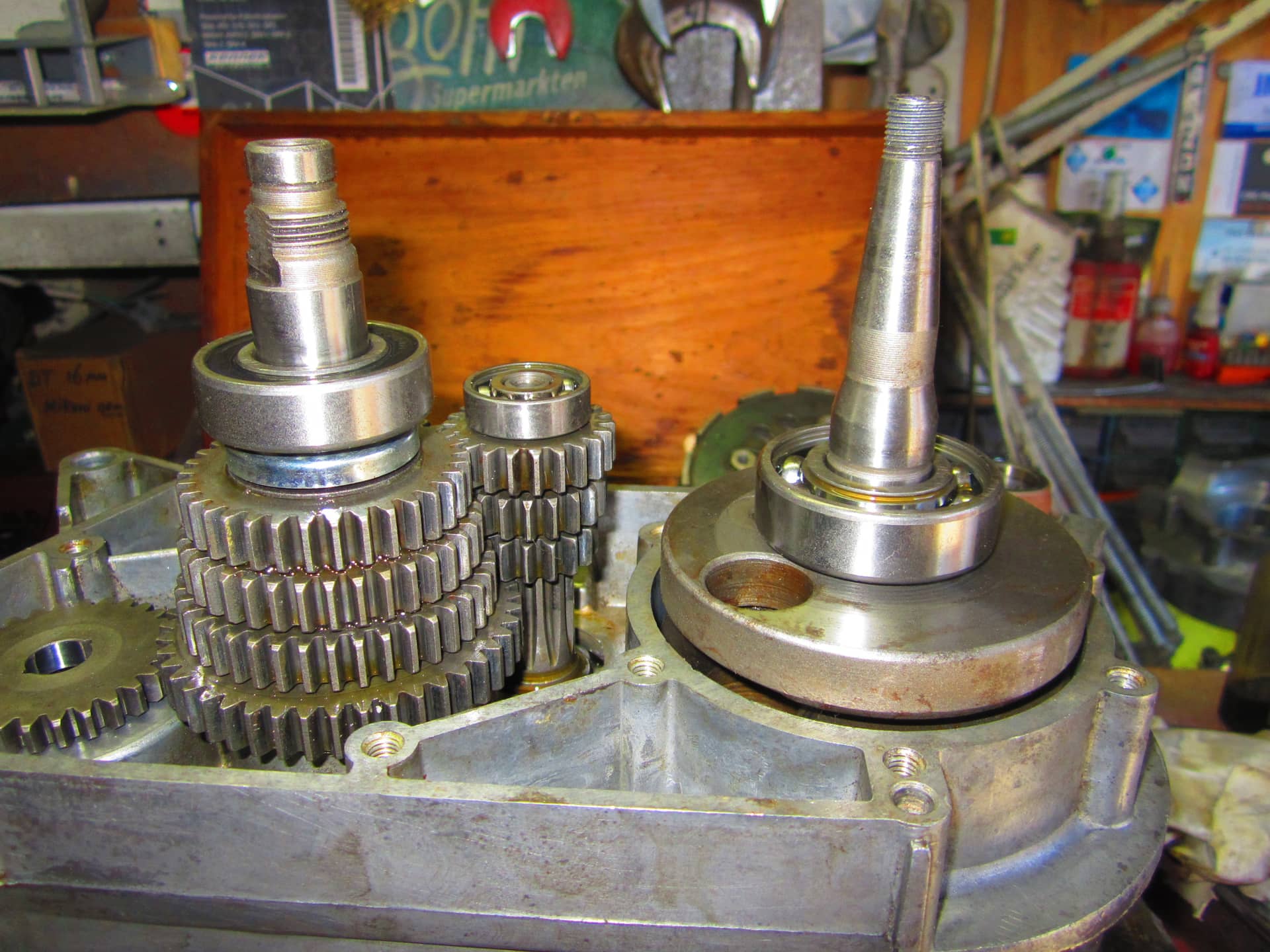 Wat mij opvalt is dat die 2 lagers al op de assen zitten. Normaal zitten ze toch in het carterdeksel en dan monteren. Hoe zit het dan met uitshimmen? Of zitten de lagers wat losser in het carter?