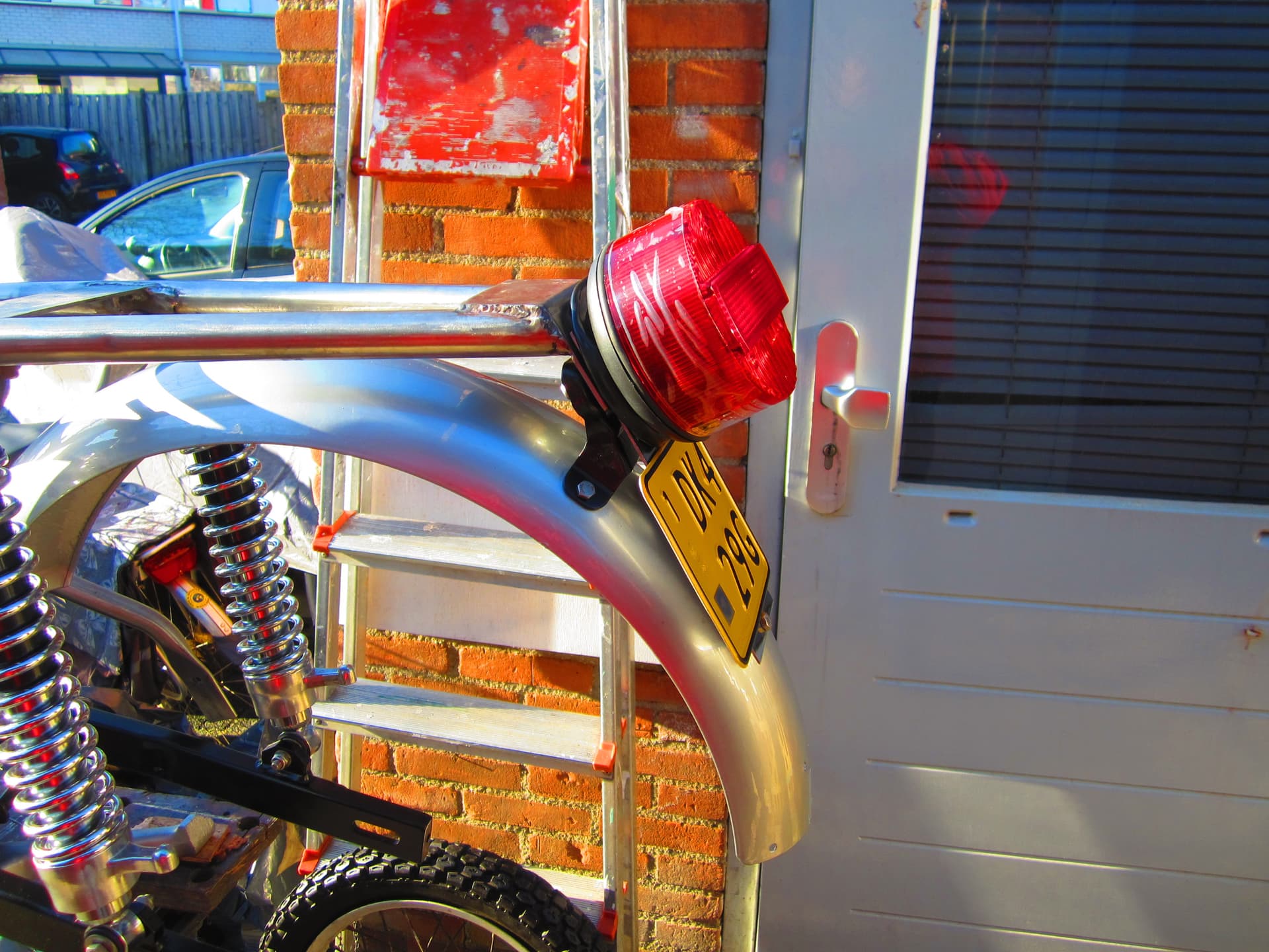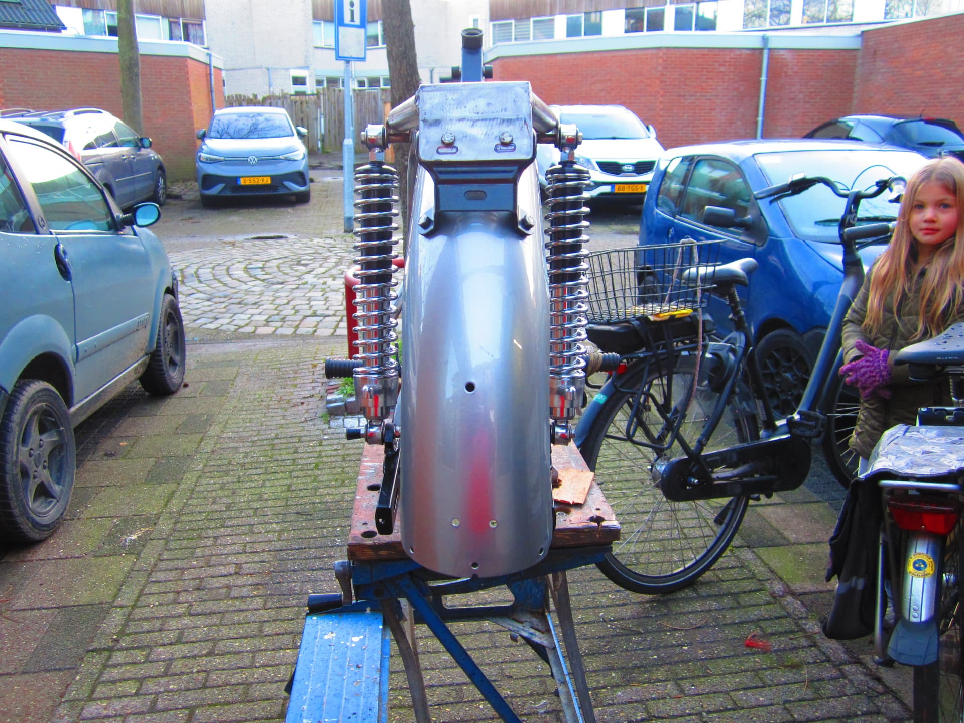 Nadat ik alles vast aan het frame gezet had ,boven bouw ,.voetsteunen ,.en de schok brekers ,kwam ik toch tot de conclusie dat de achter kant iets scheef stond ,misschien 1 cm maar dat wil ik verhelpen.