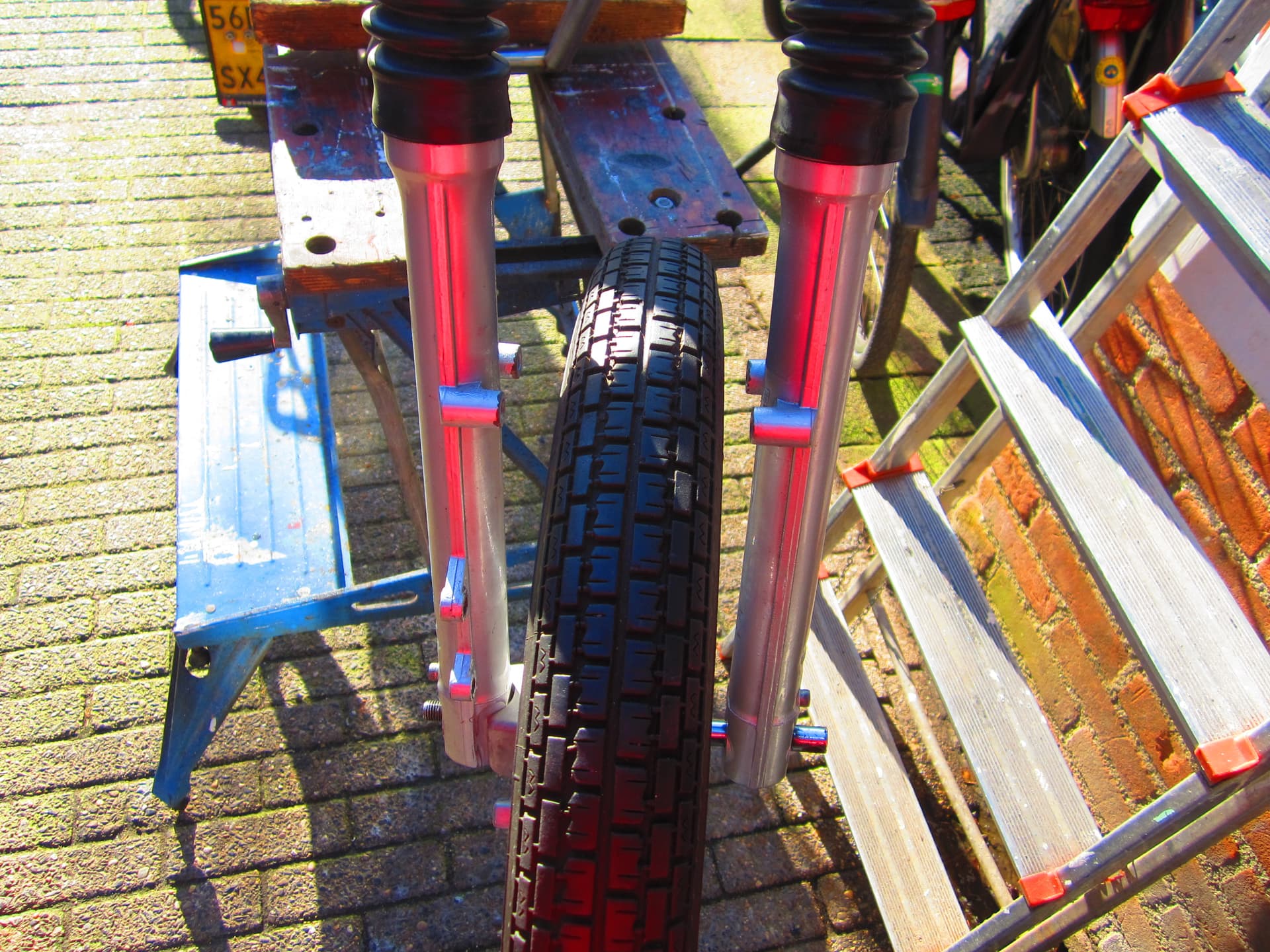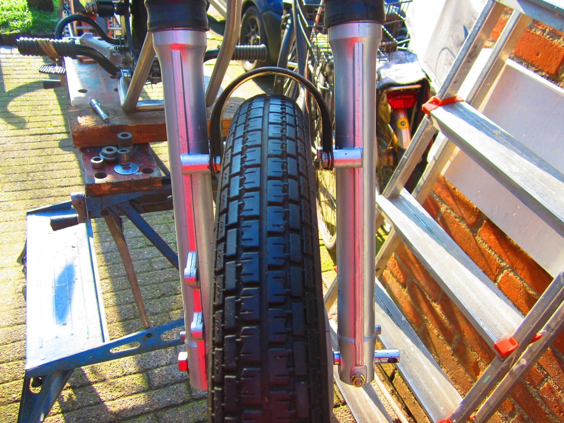Na het uit het midden spaken komt de velg precies midden tussen de vorkpoten en dus netjes in het spoor te lopen Jan