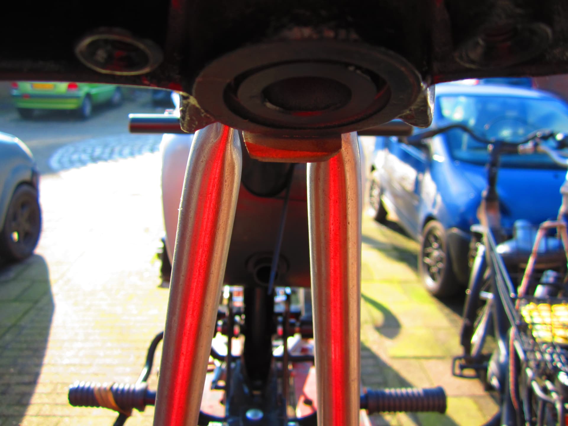 Persoonlijk zou ik hem een stukje door de voorvork laten zakken. Kan vertekend zijn door de foto hoor, maar de vork toont een beetje aan de lange kant.
