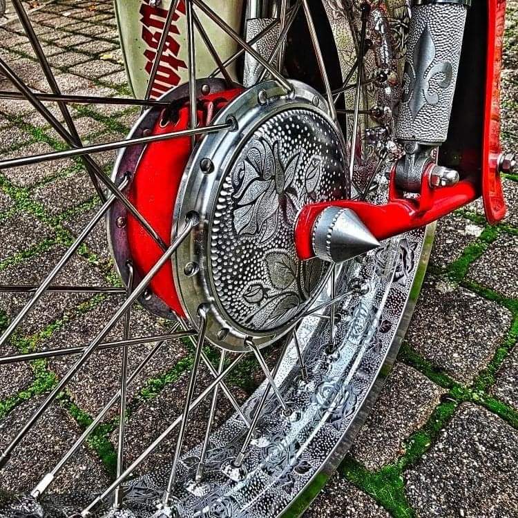 En wat dachten jullie hiervan. Ook bijzonder vind ik. Gewone spaken, maar die velgen en naaf dan? Hoe dan? Ik denk gelaserd ofzo, ge-etst? Wie zegt het?