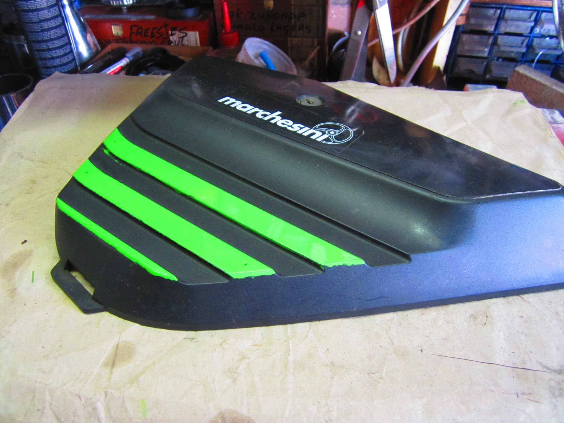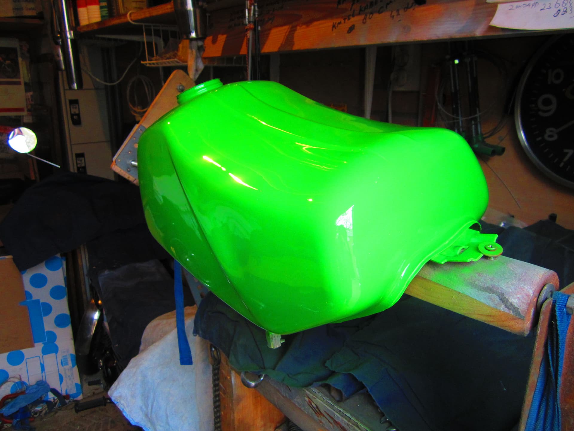 Tank is gespoten met een knikker bus slechte onder grond is iets geribbeld ,.deksel zijn gerold met lak die ik nog had staan van een Kreidler project