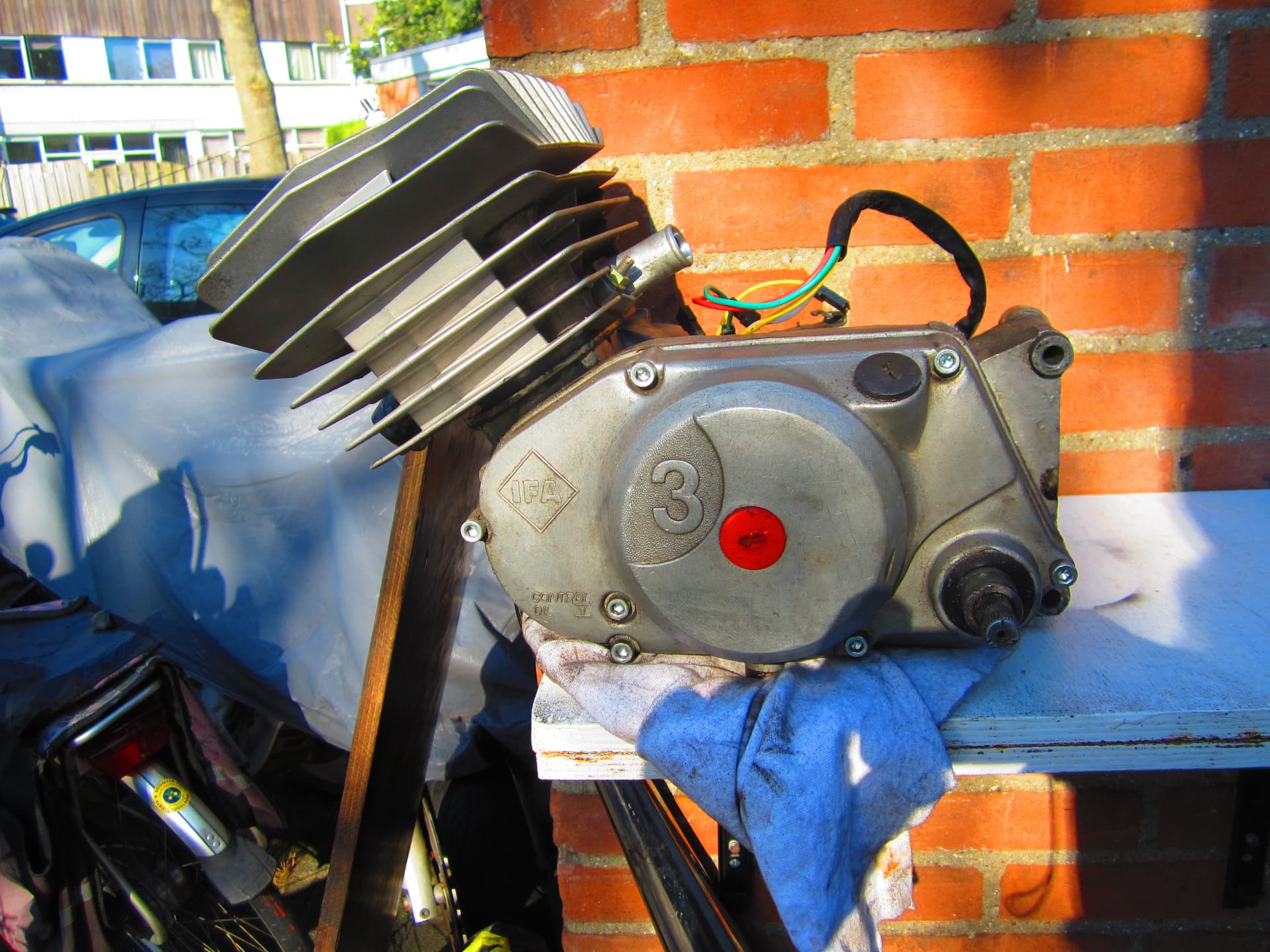 Vandaag heel mooi weer om een blokje te wisselen De S 53 waar de Minarelli cil op staat het 3 versnelling blokje gewisseld na zo n 1400 test km s voor de gereviseerde 4 versnelling die er onder hoort ,ook weer de km teller aangesloten zodat de km stand wordt bijgehouden .