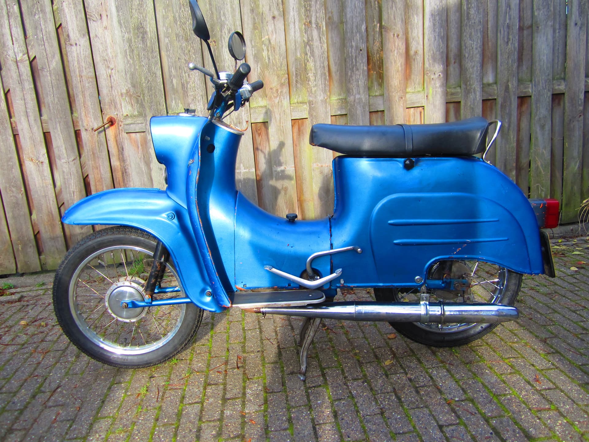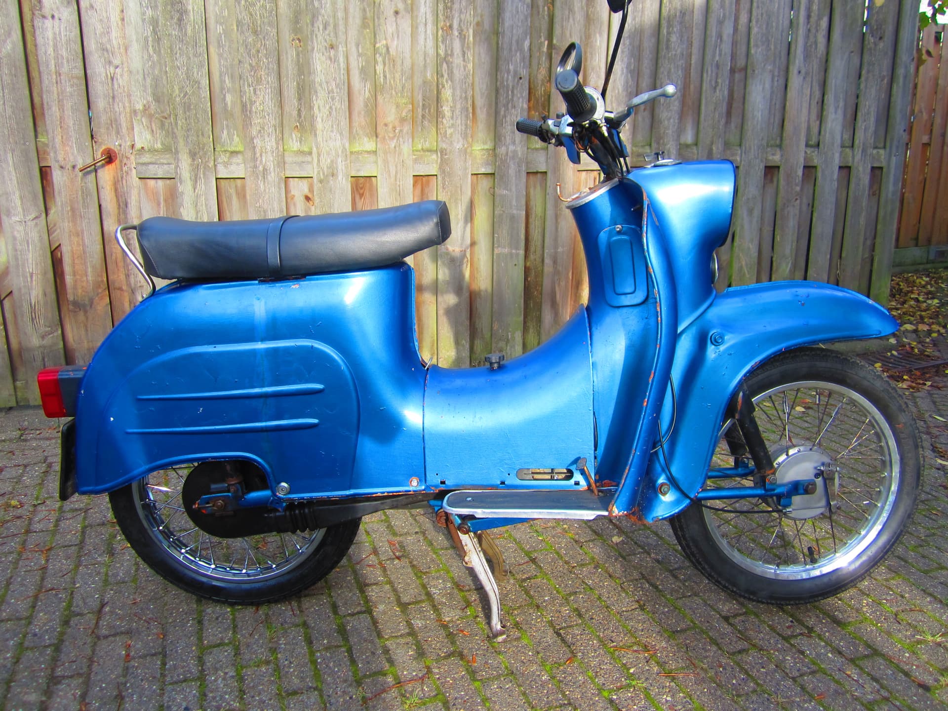 Deze brommer is ook een D D R exemplaar ,.hij lijkt een beetje op een scooter met de beenkappen, maar is een brommer . Hij heeft 3 versnellingen bediend door de voet .