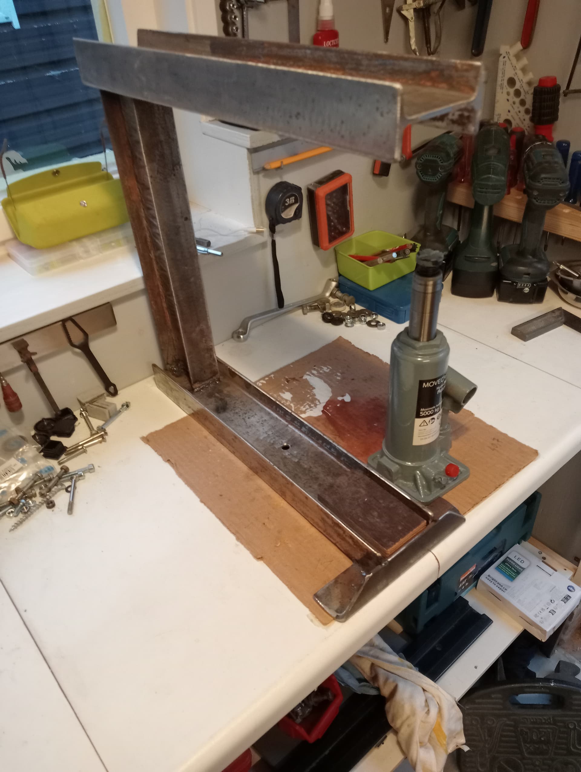 Van restmateriaal uit oude voorraad is alles gemaakt. Was is handig, hoe stevig moet het zijn met 5 tons hydraulische krik en compact voor zowel naven als complete wielen te plaatsen in de pers. Eerst concept van hout gemaakt, vervolgens aan de slag met het H profiel. 8 x 4,5 cm en 0,5 cm dik.