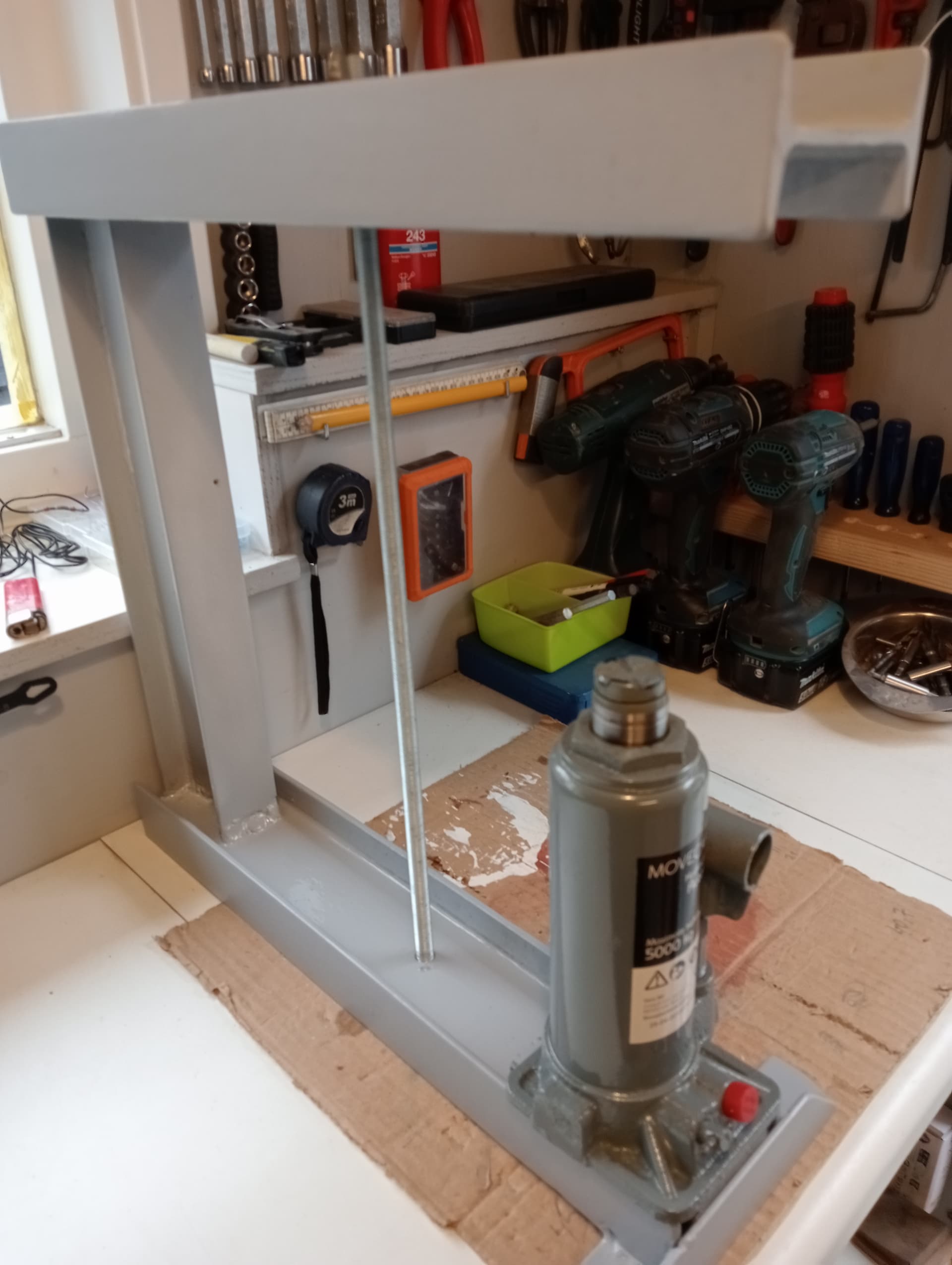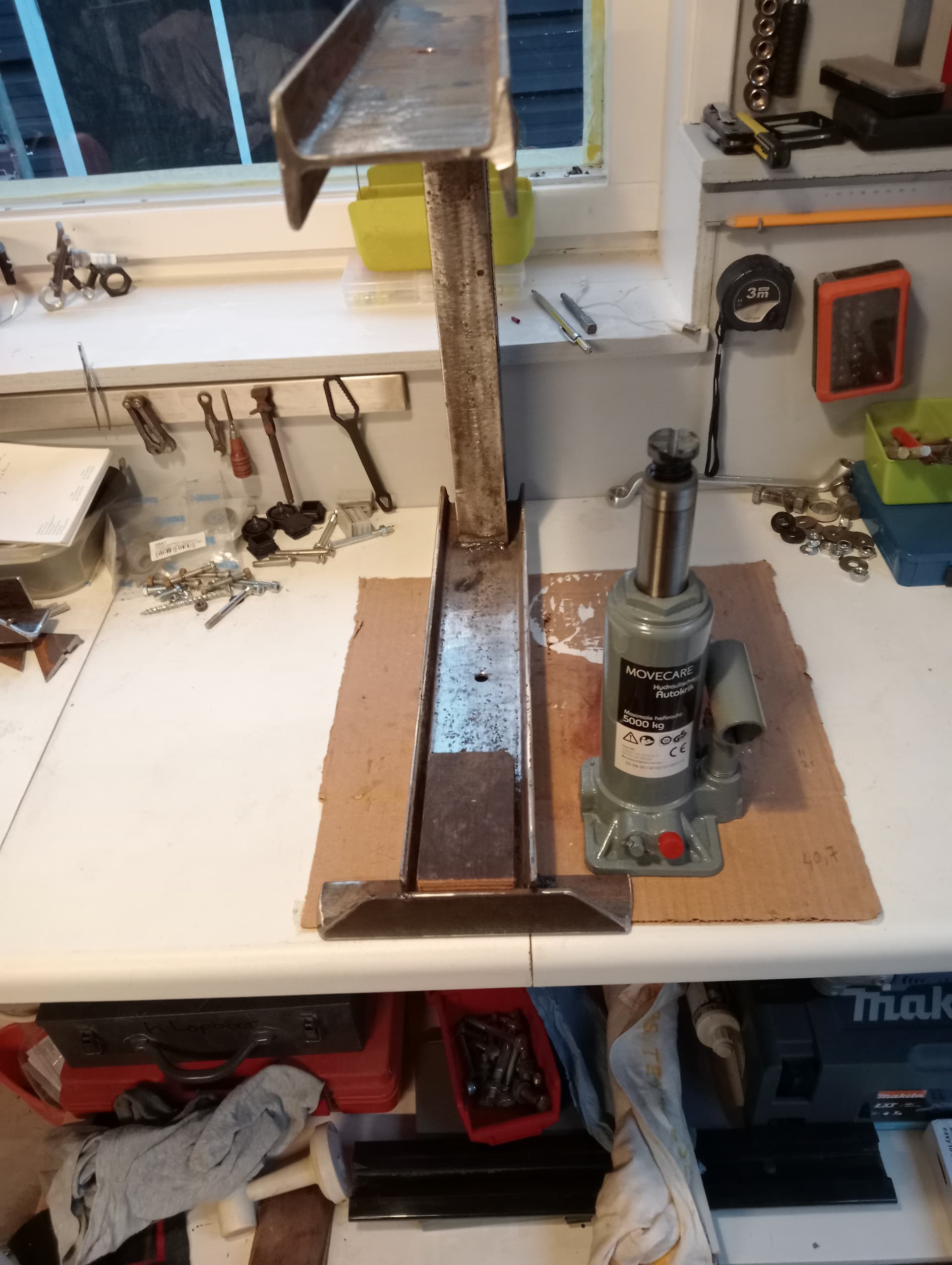 En de constructie van de pers zoals die nu is kan aan de open zijde die 5 ton ook niet hebben. Dus als er écht serieus geperst moet worden dan is een extra voorziening aan de open zijde noodzakelijk anders zal de boel ondanks het mooie laswerk toch open gaan buigen. Althans in mijn (niet technisch onderlegde) ogen.