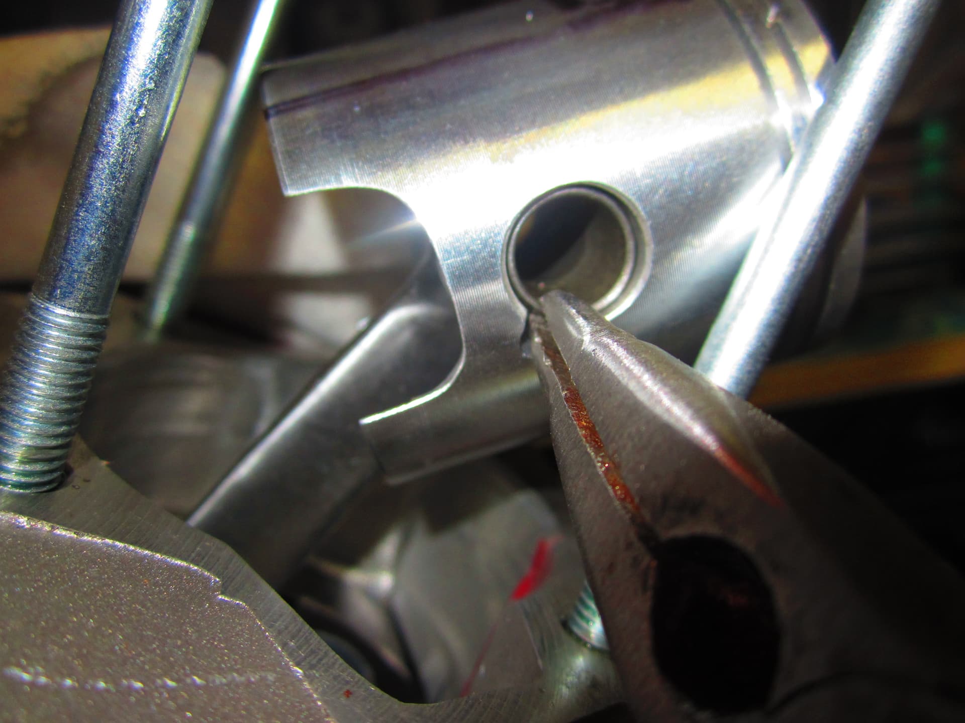 Ja ben weer eens bezig geweest ,ik weet niet of jullie het makkelijk vinden om piston borg veertjes uit en in de zuiger te krijgen ,en dan zonder ze te knijpen of te beschadigen .