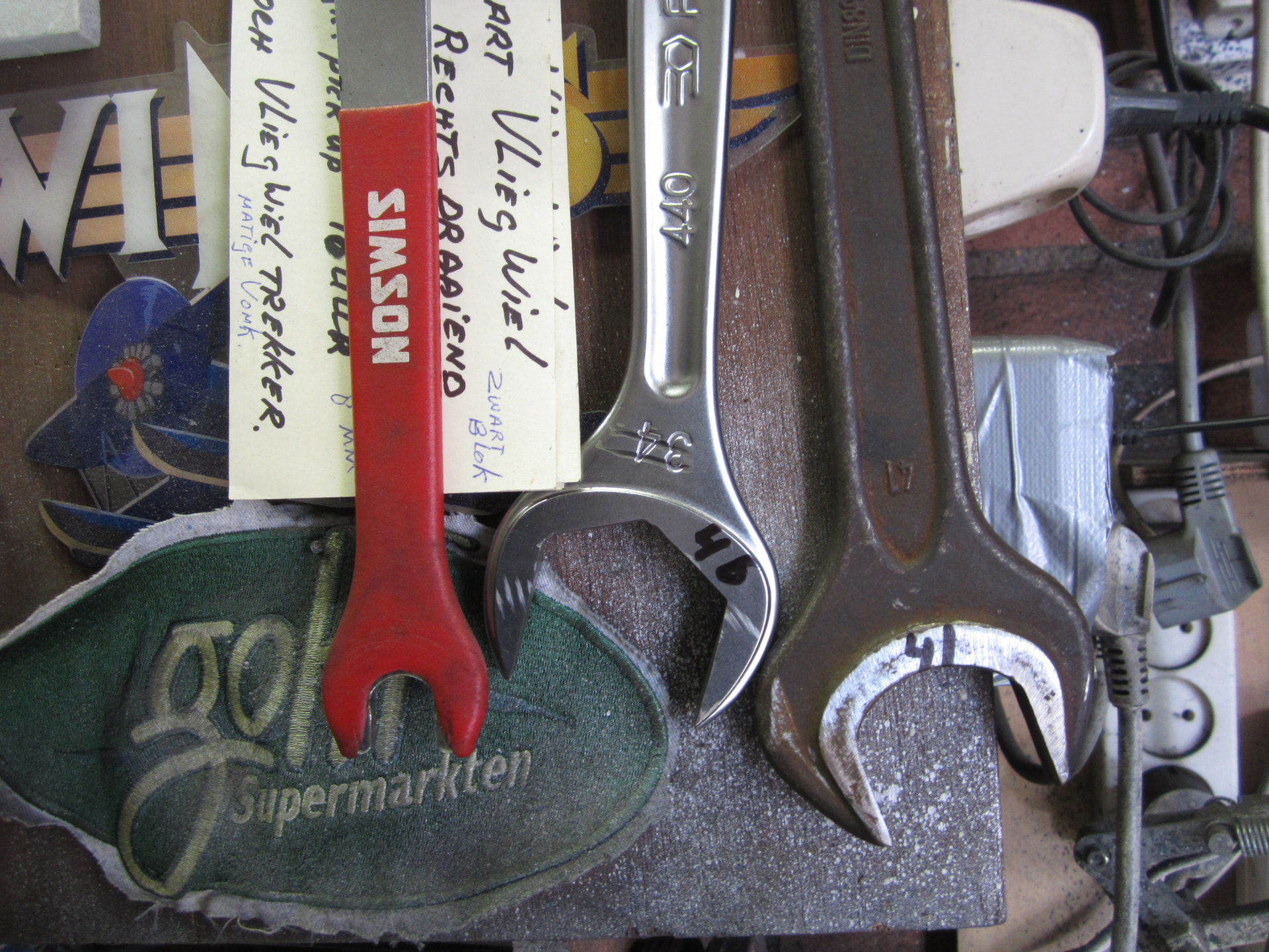De grote steek sleutels maat 41 en 46 krijg ik niet in het kastje dus hangen aan de gereedschap kast ,deze zijn voor de uitlaat moer van de Simson .