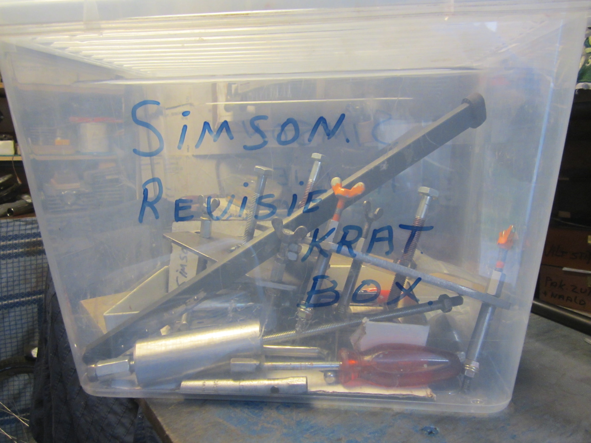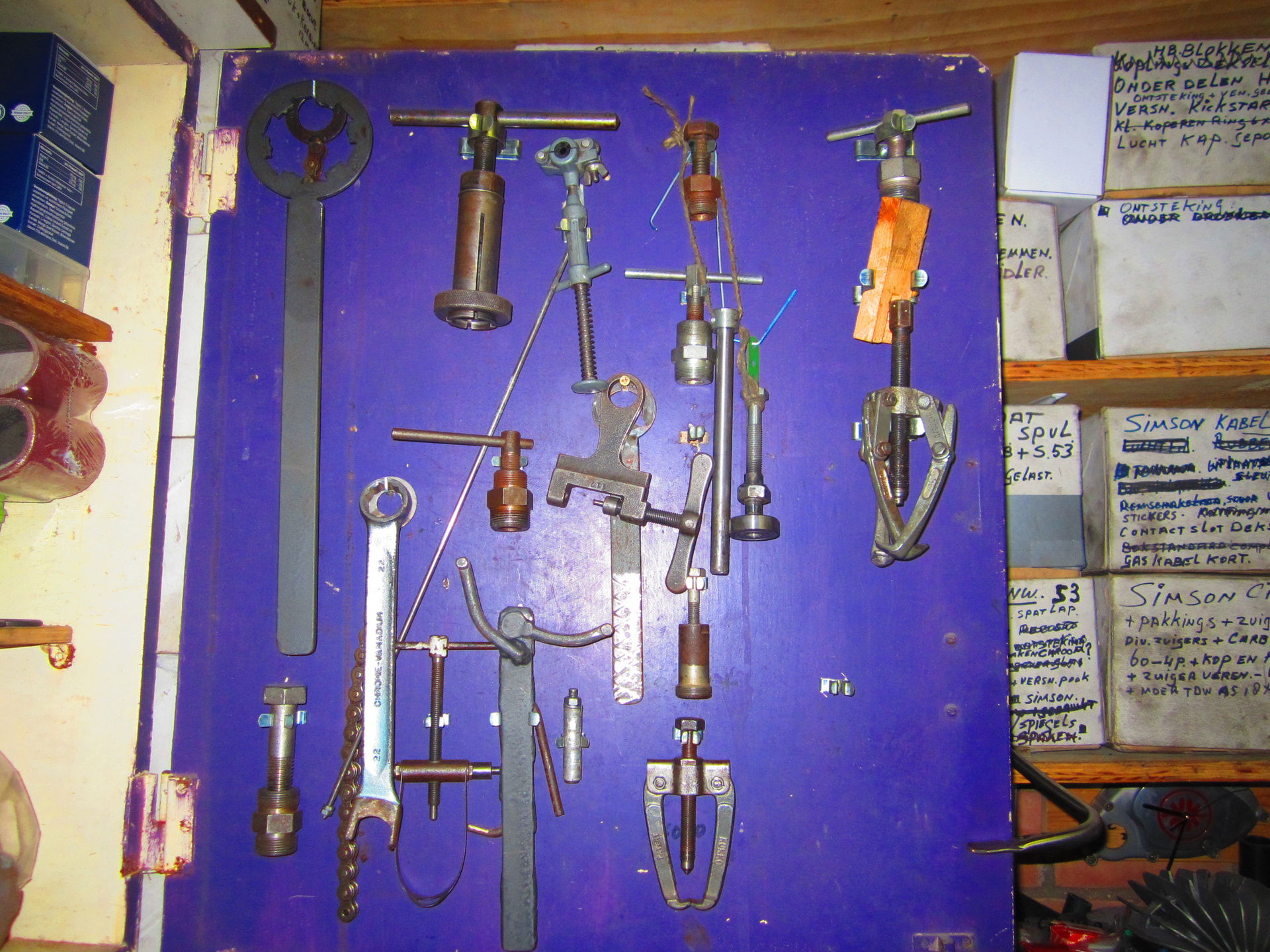 Daar hangen ook poulie trekkers en vliegwiel trekkers bij voor meerdere merken ook de lager wipper /trekker drukker is ook voor div merken ,div vliegwiel vast houders ,tandwiel vast houders ,koppeling vast houder is voor Kreidler ,. de koppeling vast houder van Simson gaat bij de rest van de Simson in de opberg doos .