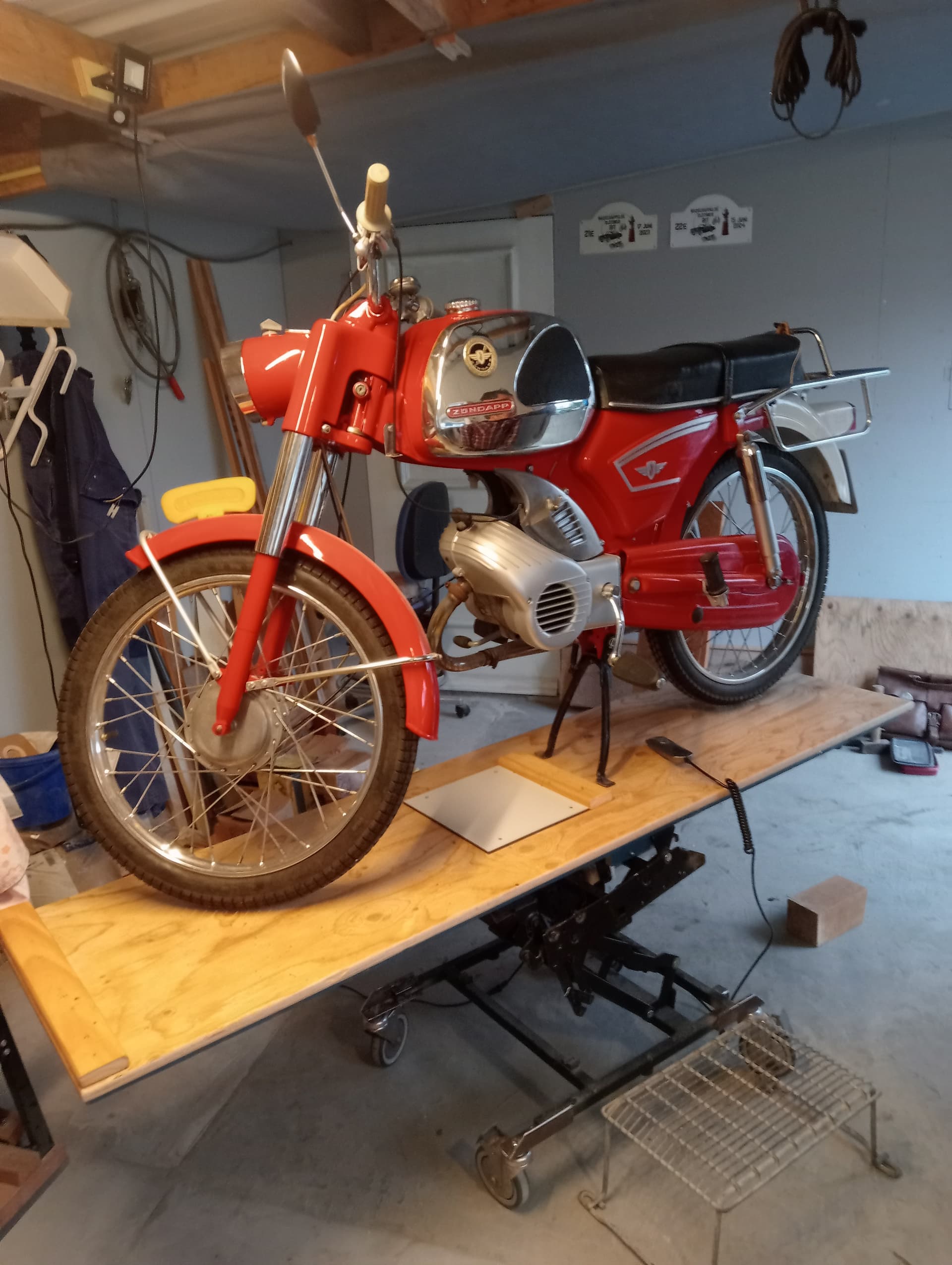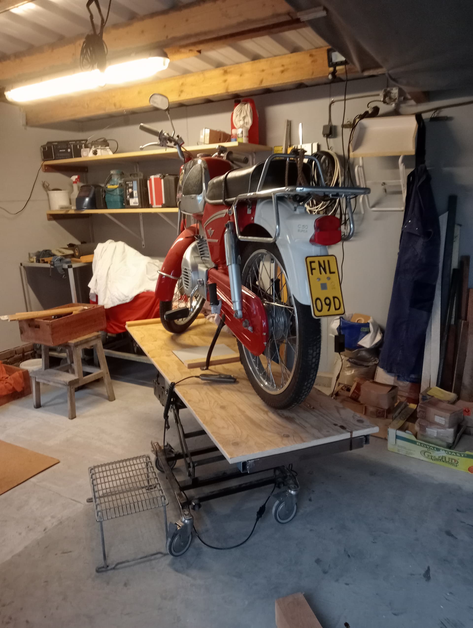 Vervolgens de proef op de som geprobeerd om met hulp van junior de stap te wagen met brommer er op. Het is gelukt, maar moet toch nog een paar aanpassingen doen om de brommer eenvoudig op de standaard te krijgen. Hoogst waarschijnlijk op de kopse kanten nog een steun monteren voor stabiliteit tijdens werkzaamheden.