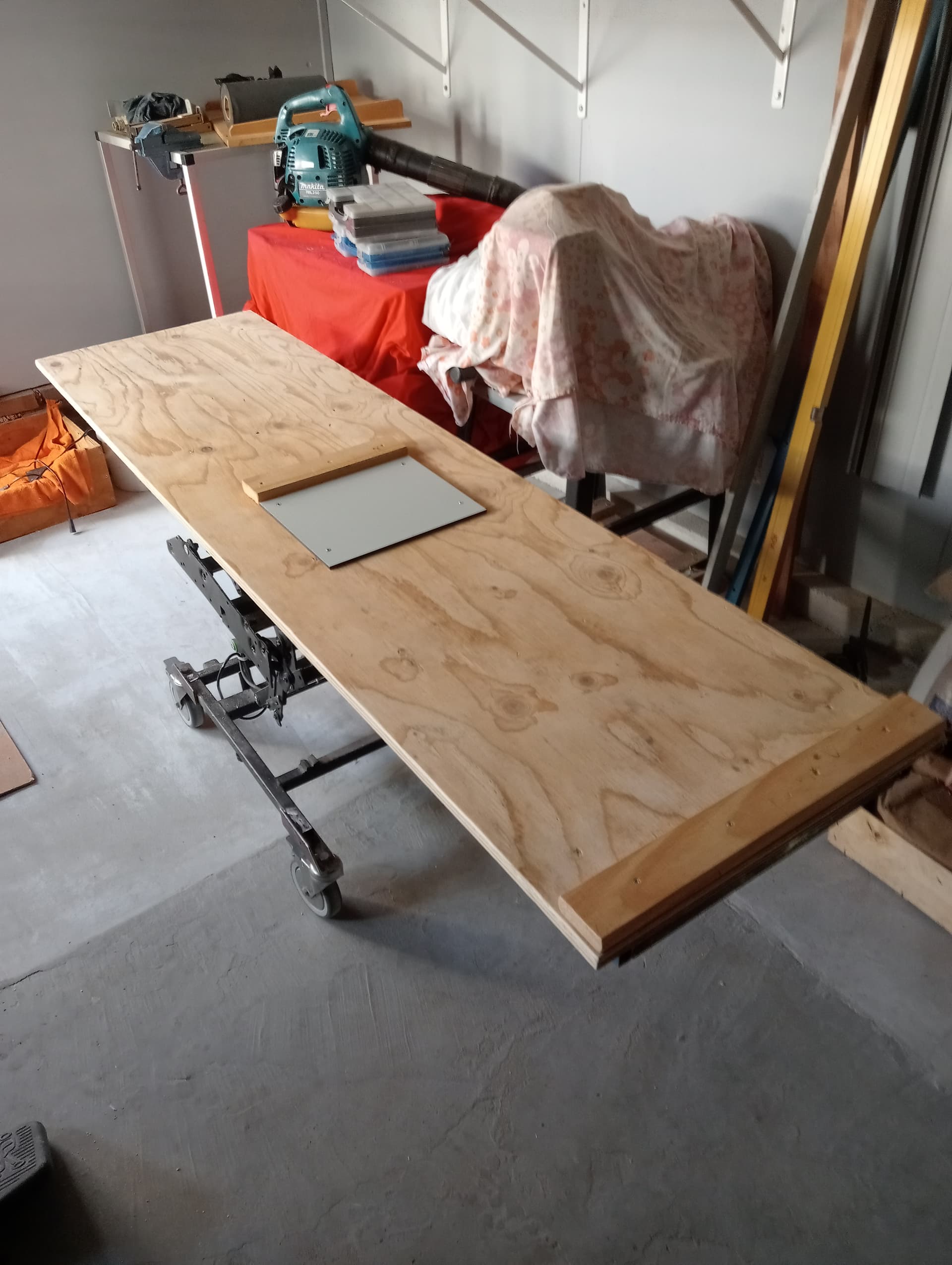 De tafel is verder opgebouwd en getest met zware grindtegels om gewicht te controleren of motor sterk genoeg is. De werking van motor is met inwendige spindel dus kan in principe niet zakken. Aan voorkant een aanslagbalkje gemaakt dat de brommer niet te ver naar voren rijdt. Dun plaatje trespa op plaat voor standaard te gebruiken zonder beschadiging plaat.