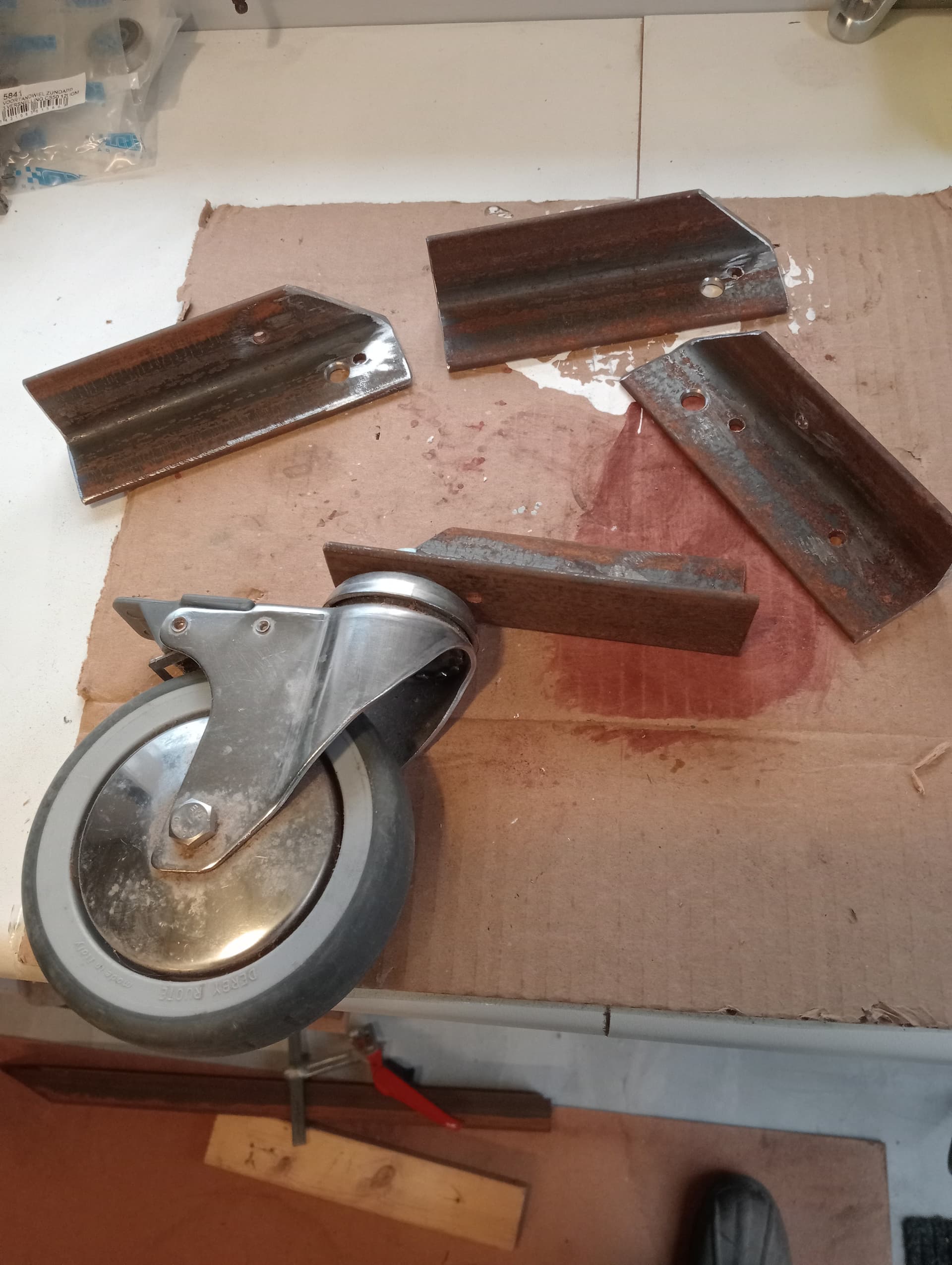 Vandaag nog wat gefreubeld en voorwerk gedaan. Hoekstukken gemaakt voor de zwenkwielen met rem te monteren. Deze op iedere hoek vastlassen, zodat onderstel ook iets groter wordt voor de stabiliteit.