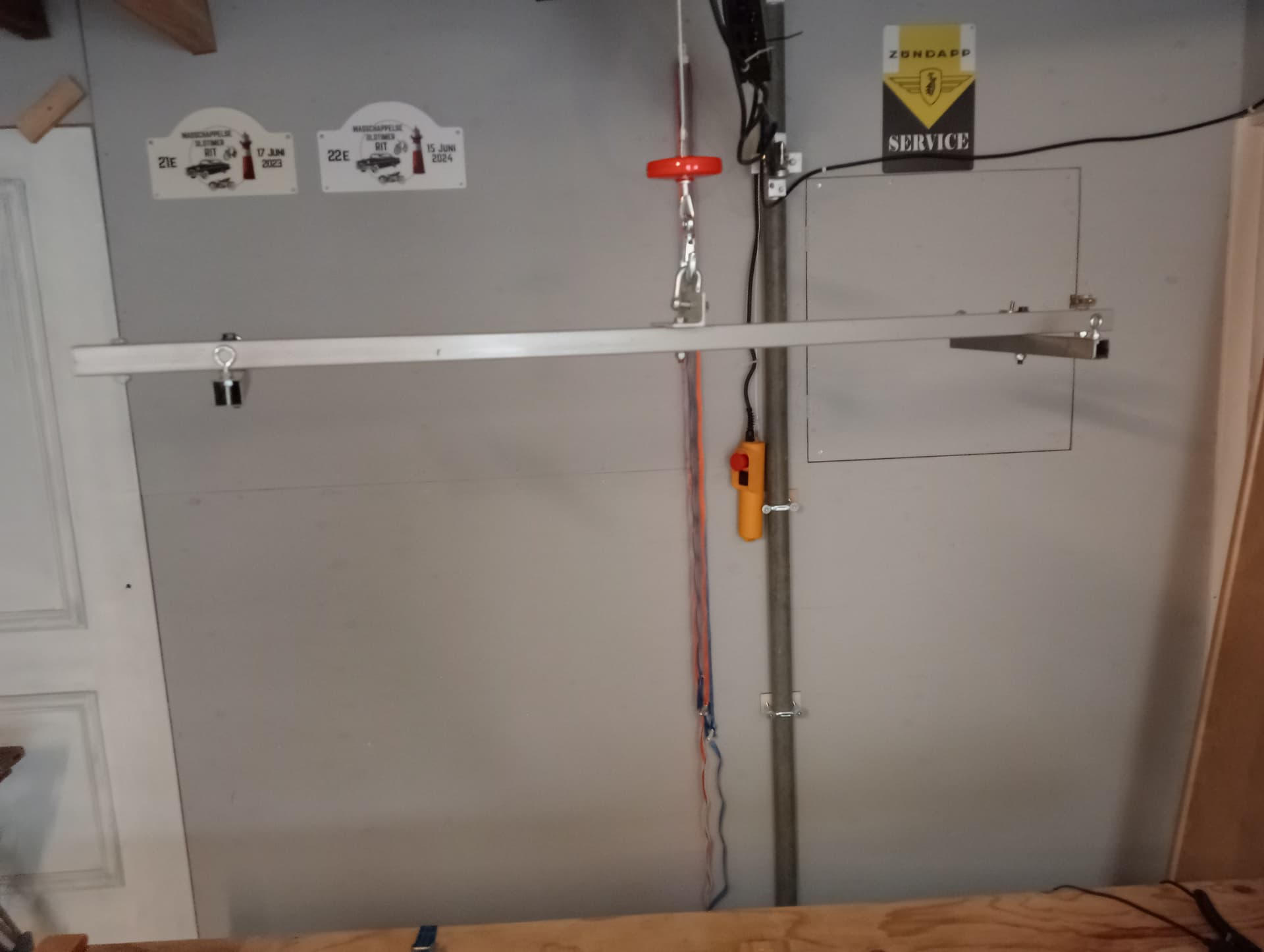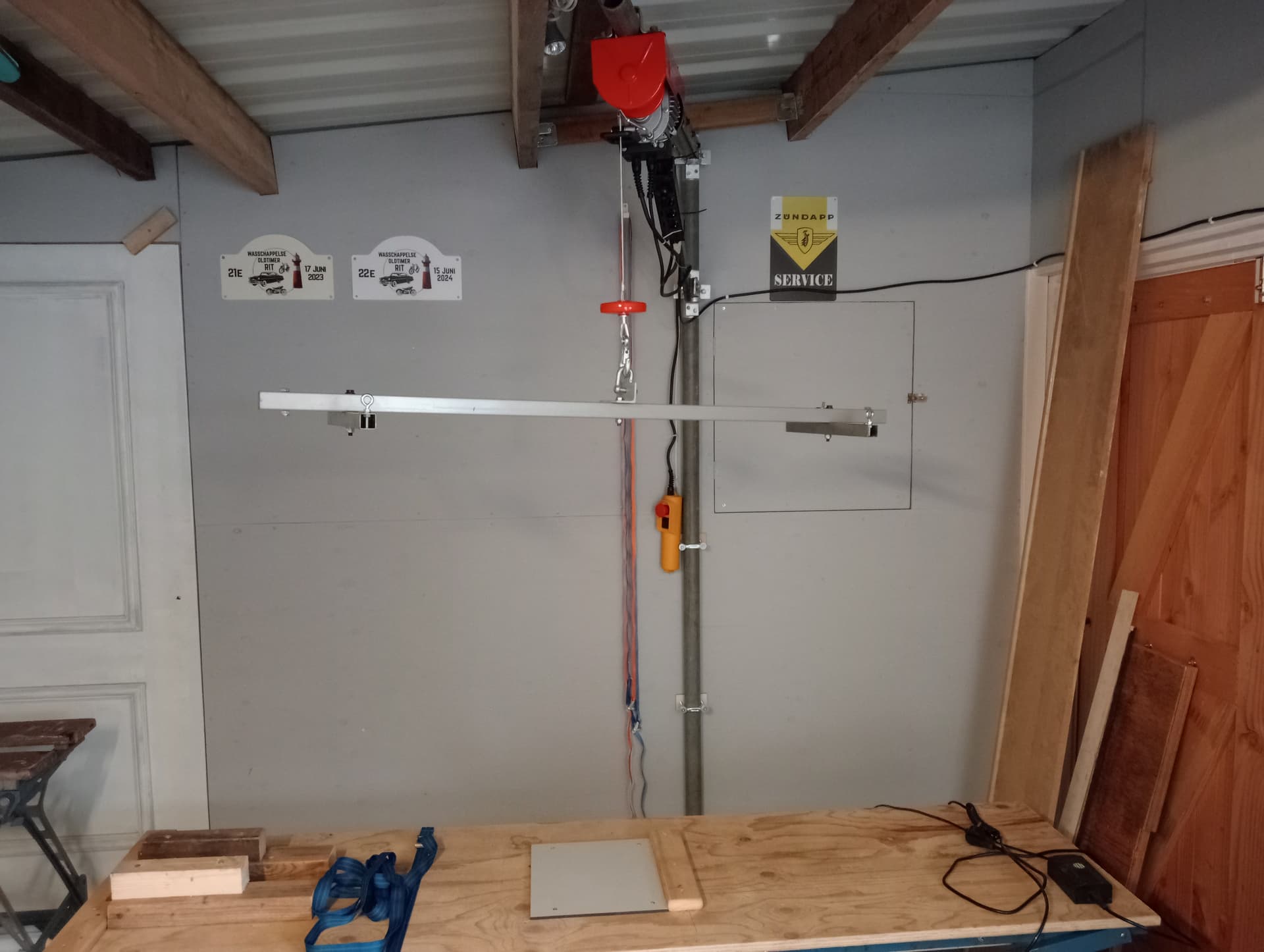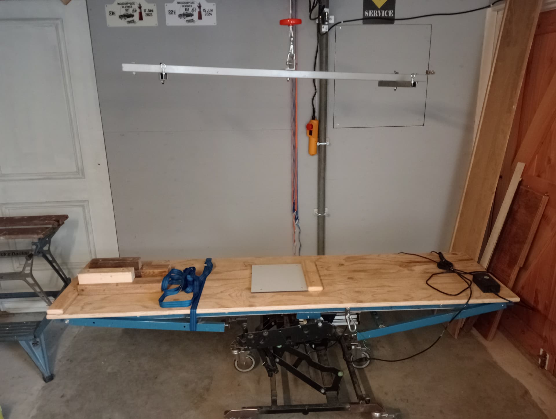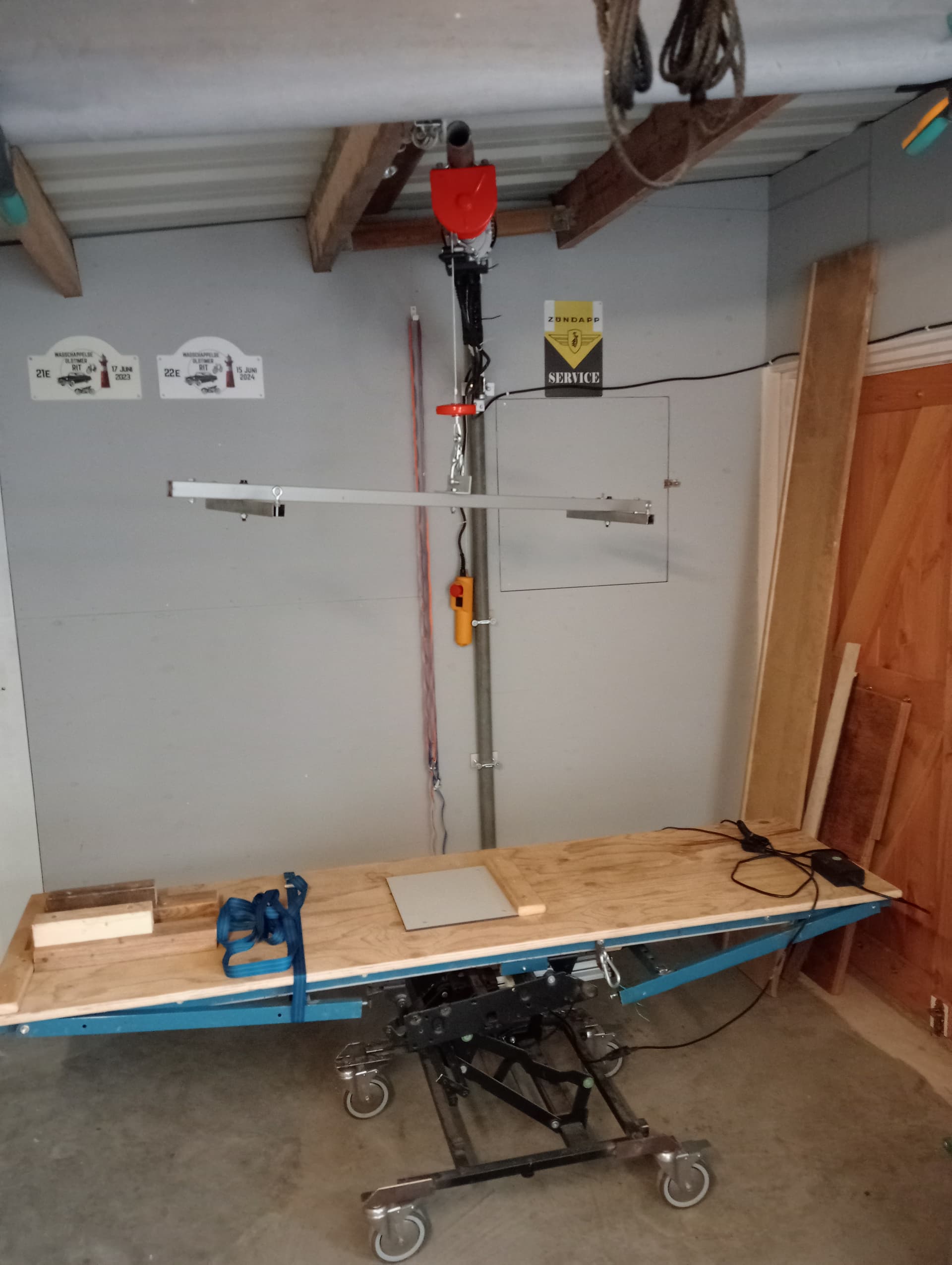 De takel even met 1 haak geprobeerd met juk bevestiging er aan. Ook gelijk 2 inklapbare steunen gelast en met stelbouten aan de onderkant zodat ik de tafel als de brommer er op staat en hij staat op zijn plek om te sleutelen kan stabiliseren. Even noodzakelijk andere prioriteiten er tussendoor gekregen die voorrang hadden.