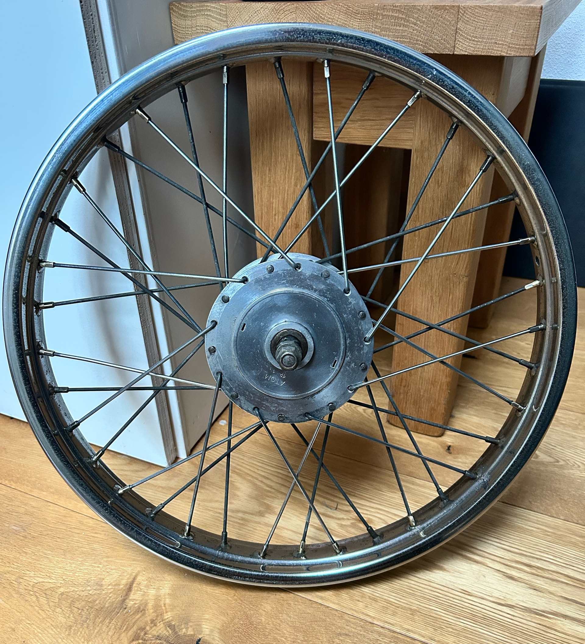 Dit was maar oefenmateriaal ik weet op dit moment niet eens waar het wiel oorspronkelijk uit komt. Het is een set. Voor- en achterwiel beiden met een “Atom” naaf.