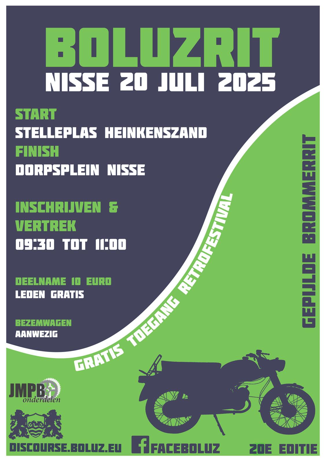 Op Zondag 20 juli organiseert Boluz hun jaarlijks terugkerende Boluzrit met als eindpunt het Muziekfestival Nisse, waar de deelnemers hun brommers tentoon kunnen stellen aan het publiek.
